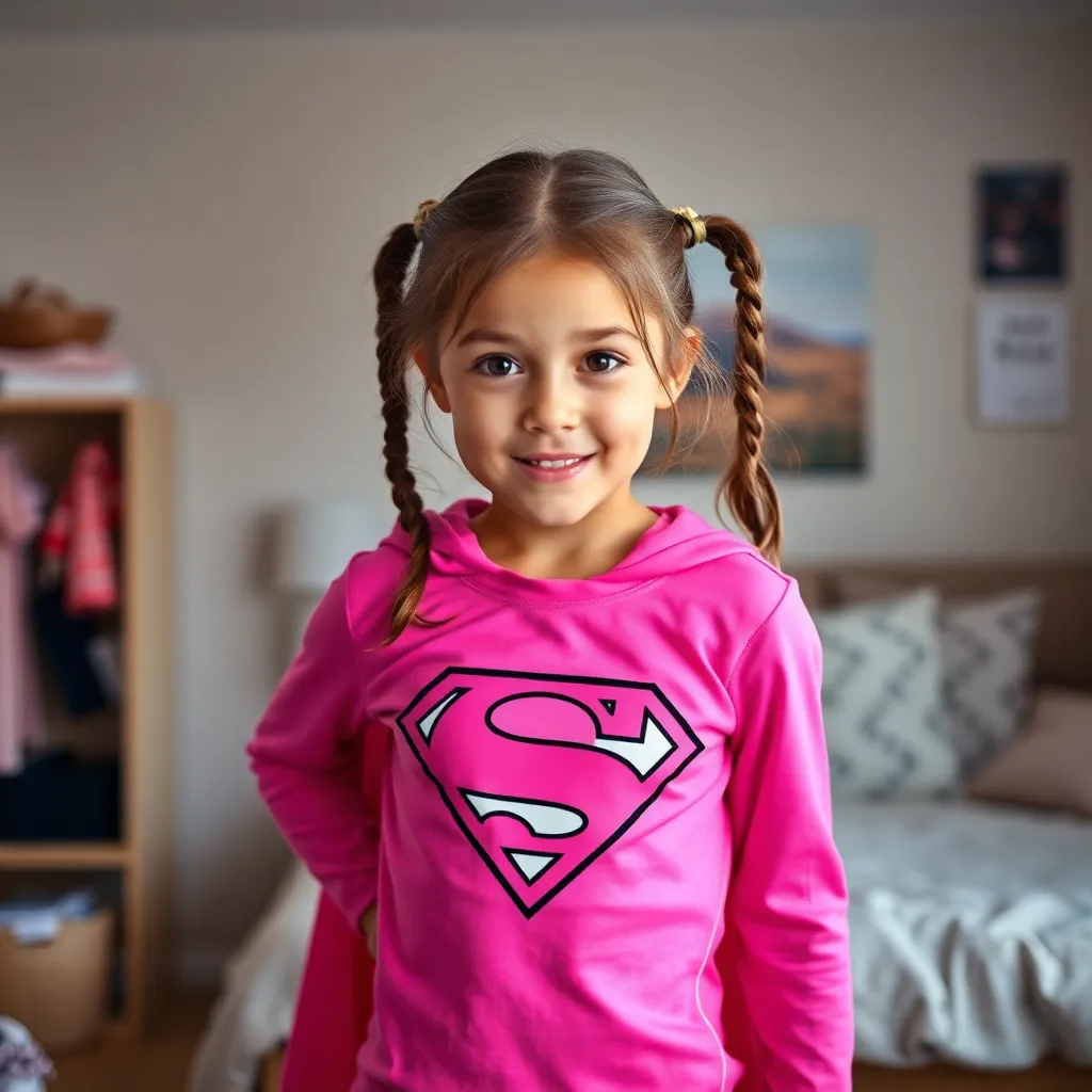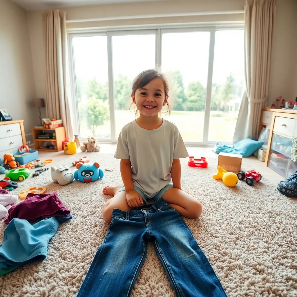 A young girl, around 8 years old, is sitting on a plush carpet in her bedroom, surrounded by a mess of toys and clothes. She is wearing a worn-out t-shirt and shorts, and has a pair of jeans and a favorite t-shirt on the floor, ready to be changed into. The room is filled with natural light, and there is a large window with a view of a beautiful garden outside. The girl is looking up at the camera with a smile, excited to show off her new outfit.