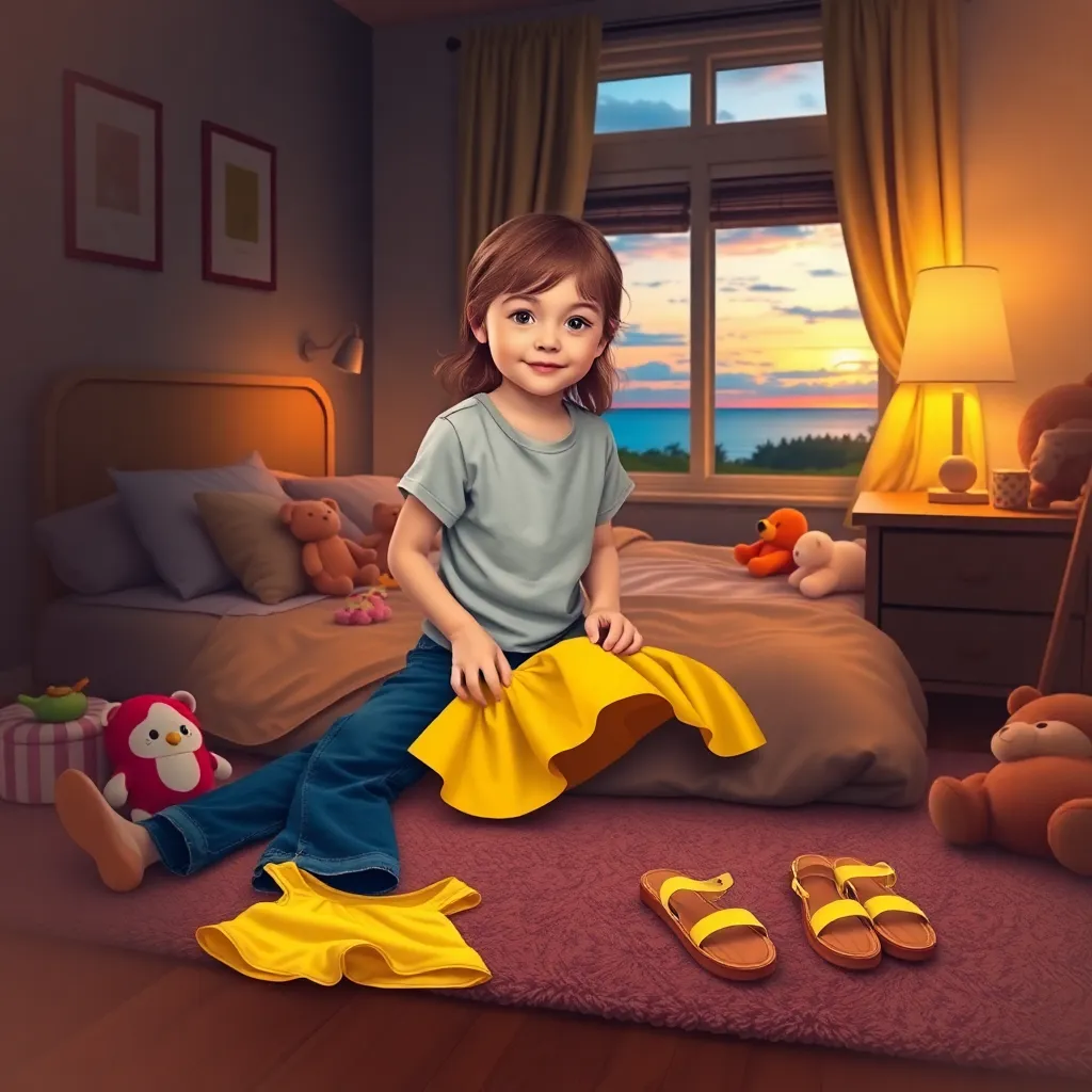 Create an image of a cozy bedroom with a little girl changing her clothes. She's sitting on the bed, surrounded by toys and stuffed animals. She's wearing a worn-out t-shirt and has a pair of jeans on the floor. There's a fresh outfit laid out next to her - a bright yellow sundress and matching sandals. The room is dimly lit with a warm glow, and there's a window with a beautiful sunset view in the background.