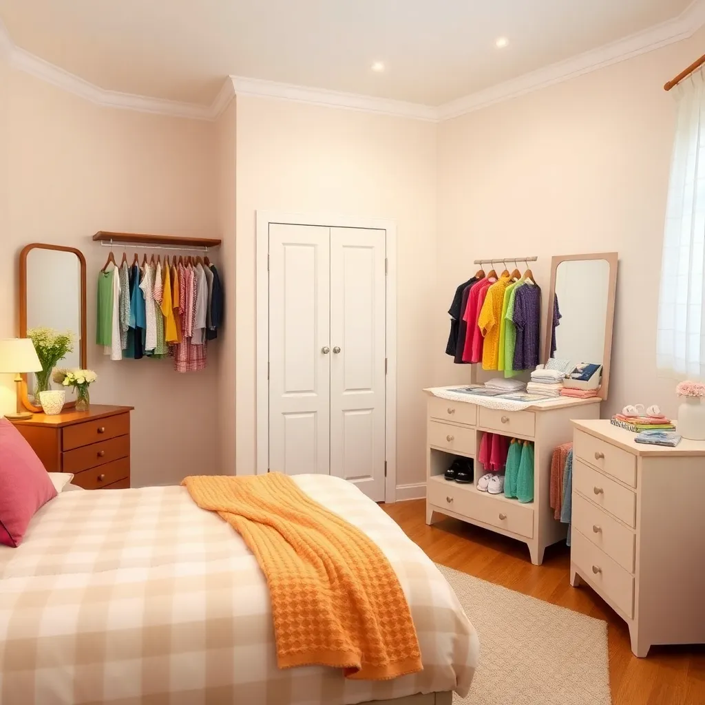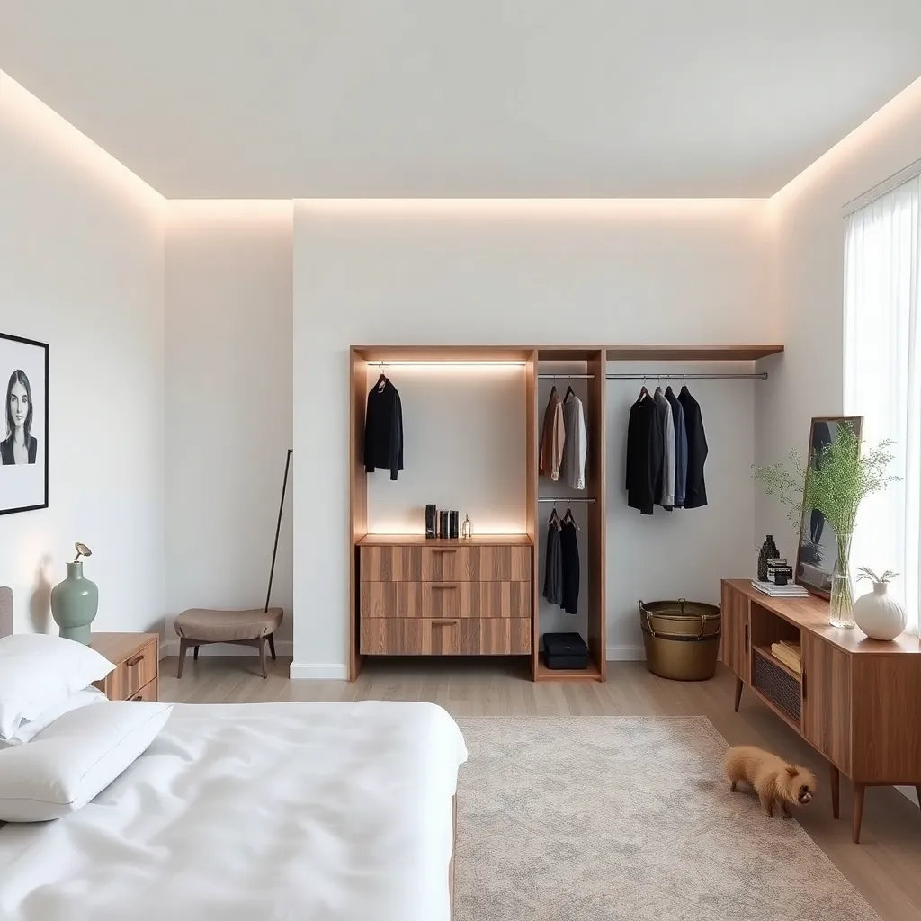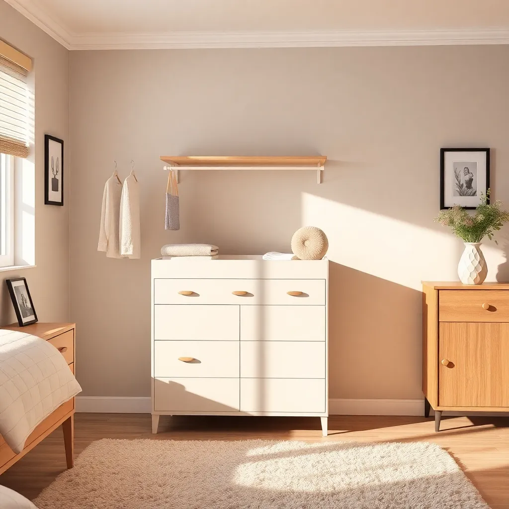 Create an image of a trendy and cozy bedroom with a clothes changer, a wooden dresser, and a plush area rug. The clothes changer should have a minimalist design with a soft, pastel color palette. The room should be illuminated with warm, natural light and have a few personal touches, such as a framed photo and a vase with fresh flowers.