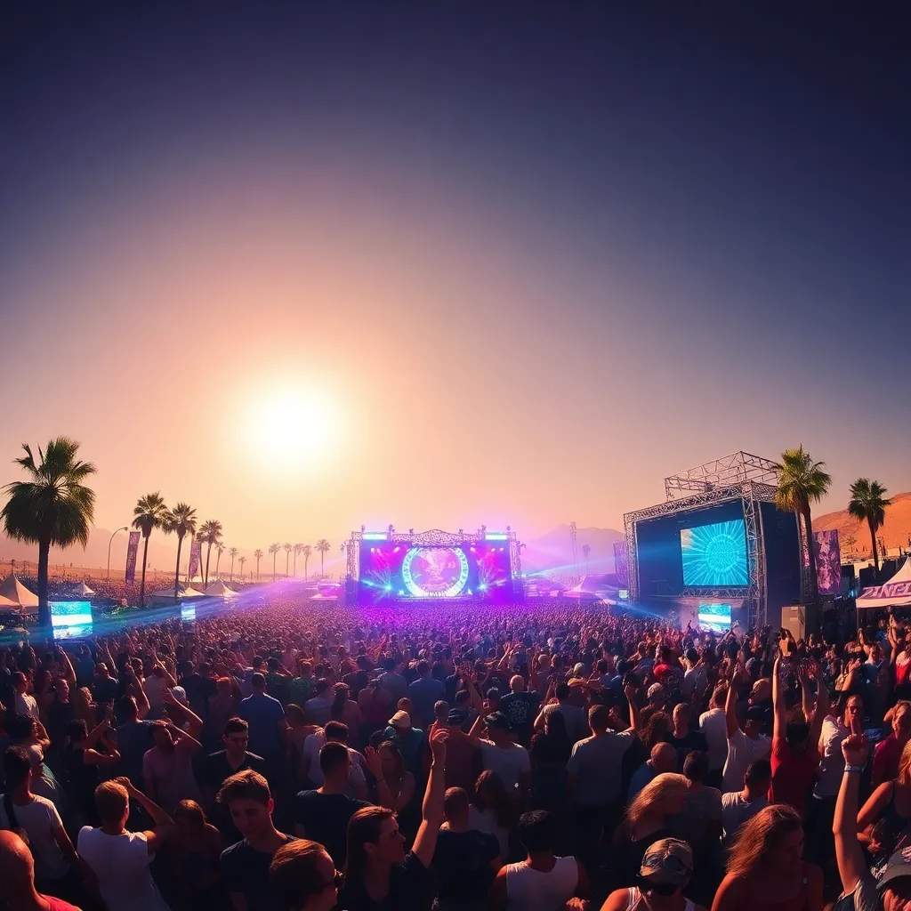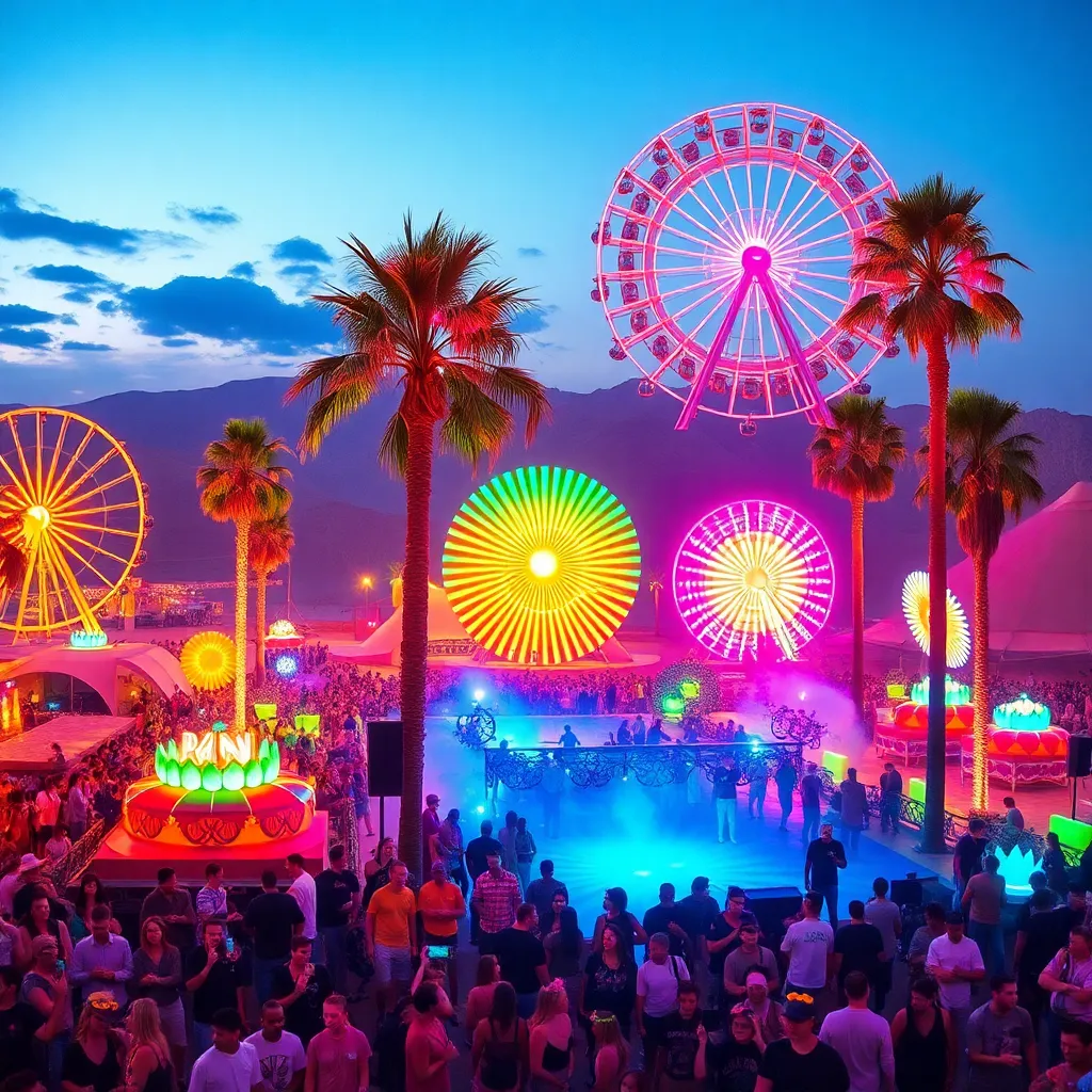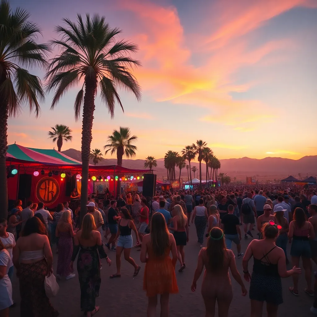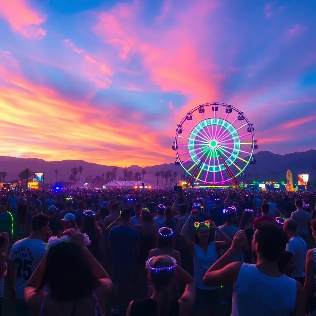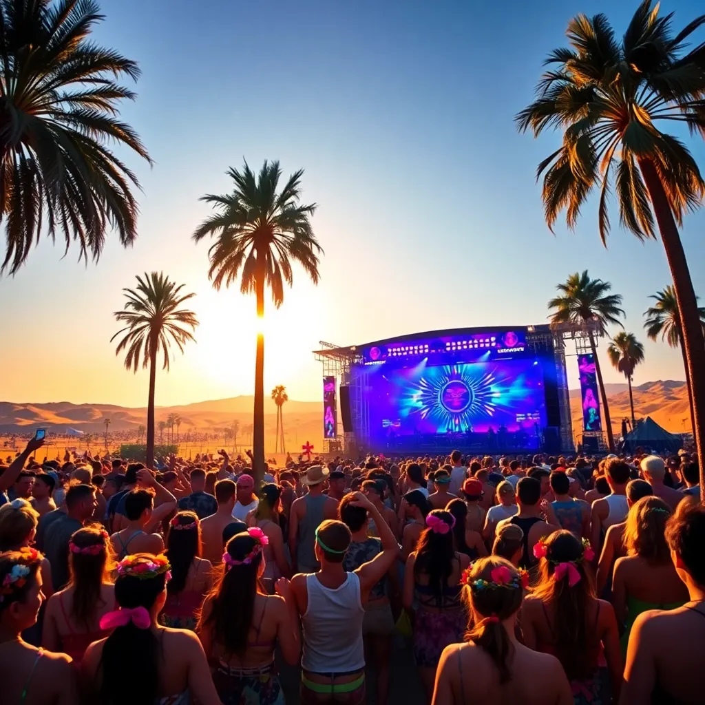a vibrant desert oasis where music meets art. Imagine a warm sunset backdrop, with a sea of colorful festival-goers dancing in front of a giant stage. Incorporate iconic festival elements like palm trees, flower crowns, and neon-lit wristbands. Create a mesmerizing scene that pulses with energy and creativity.