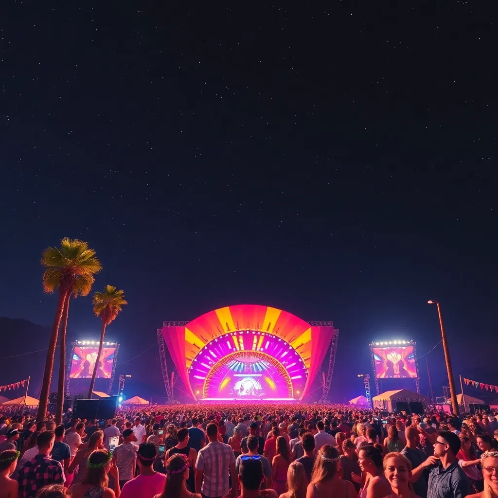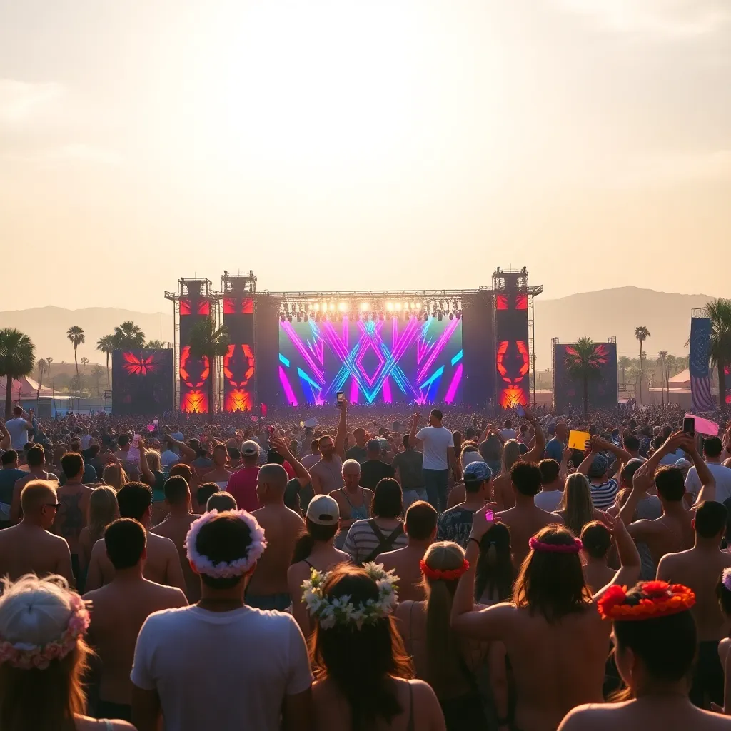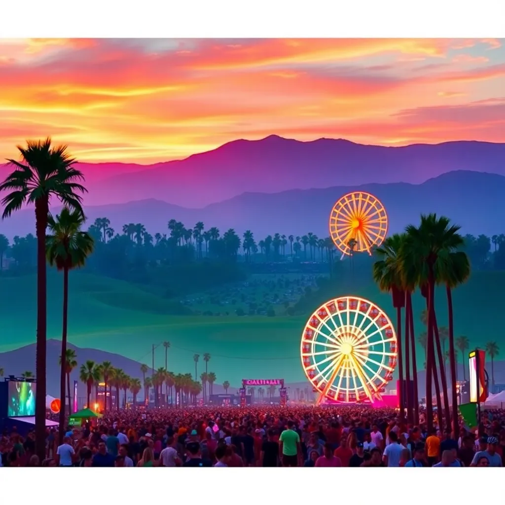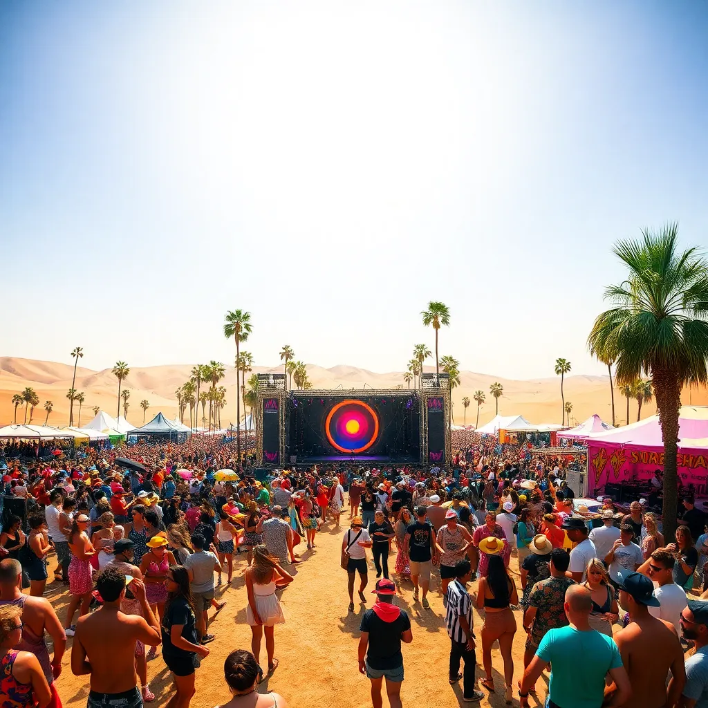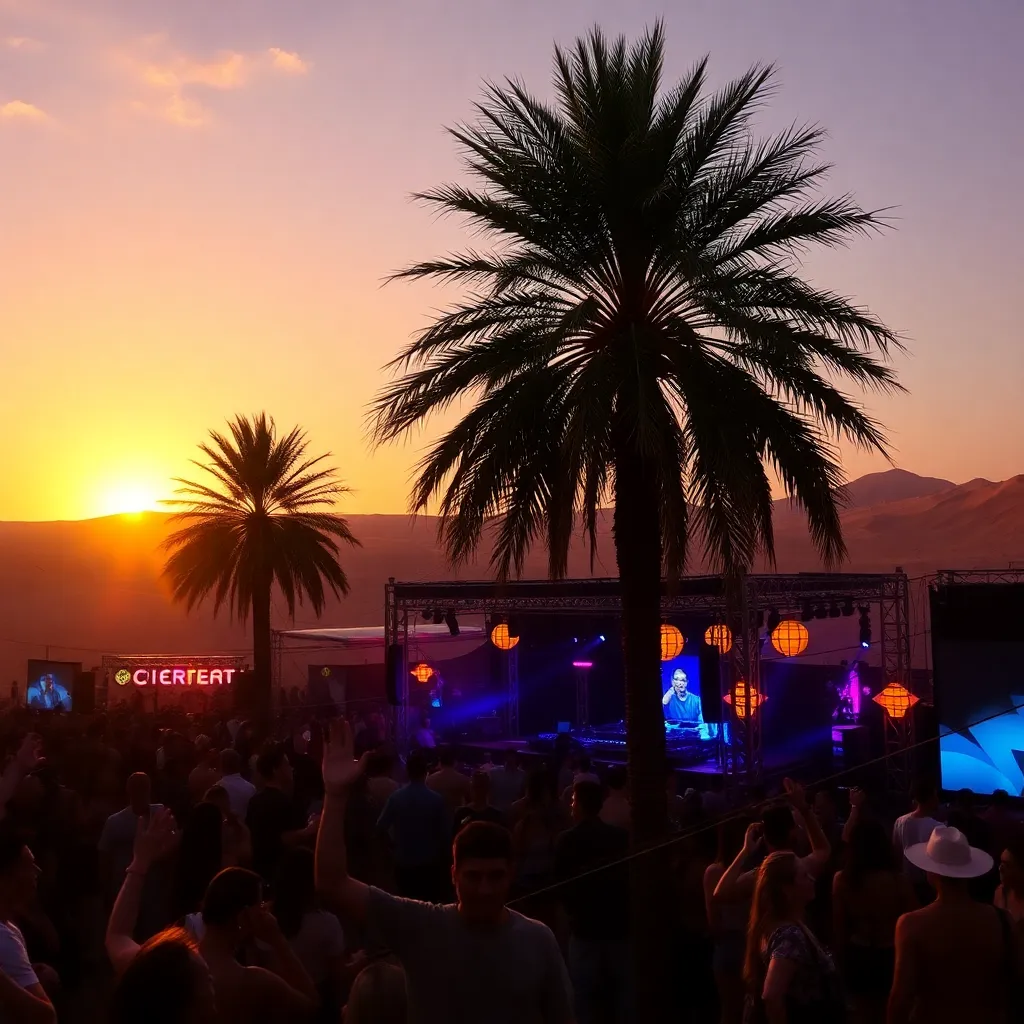 a vibrant desert oasis where music meets art. Imagine a warm sunset backdrop, with a sea of colorful festival-goers dancing in front of a giant stage. Incorporate iconic festival elements like palm trees, flower crowns, and neon-lit wristbands. Create a mesmerizing scene that pulses with energy and creativity.