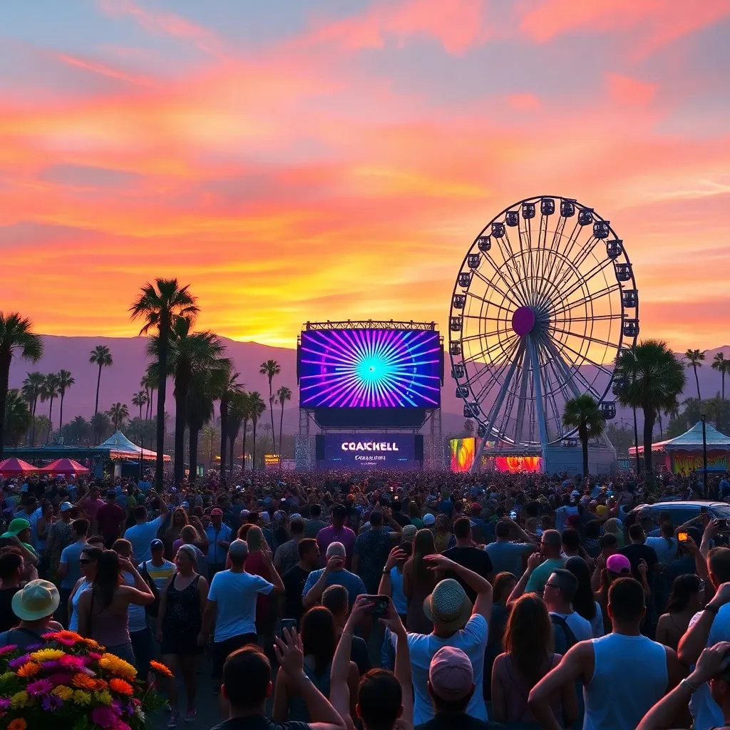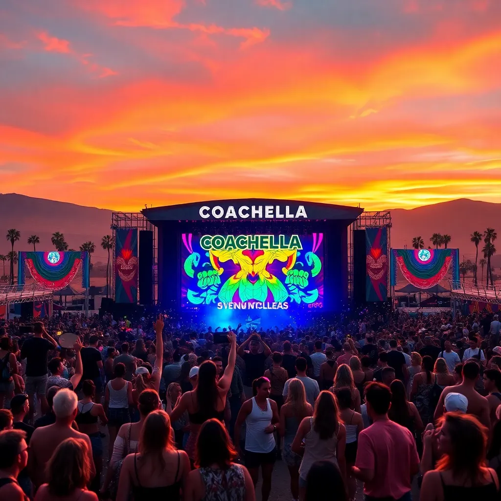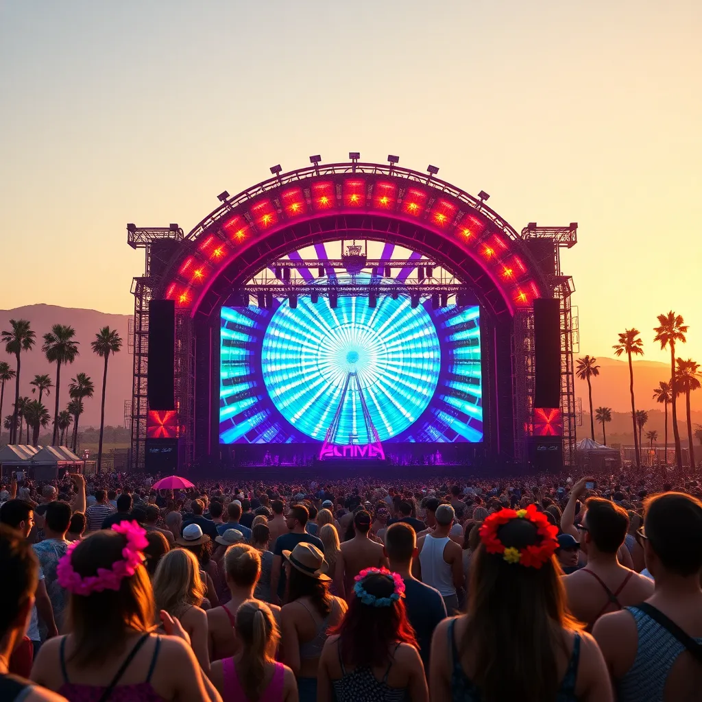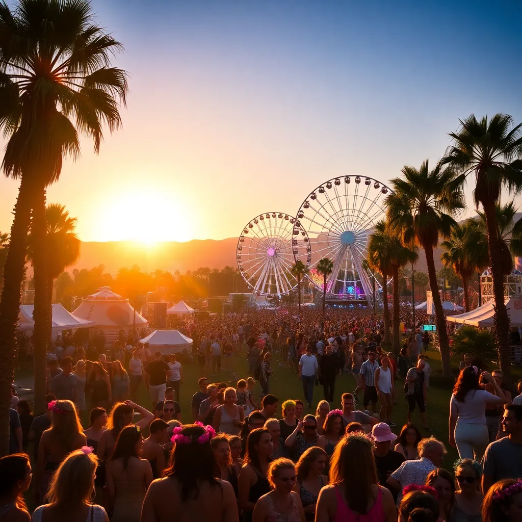 a vibrant desert oasis where music meets art. Imagine a warm sunset backdrop, with a sea of colorful festival-goers dancing in front of a giant stage. Incorporate iconic festival elements like palm trees, flower crowns, and neon-lit wristbands. Create a mesmerizing scene that pulses with energy and creativity.