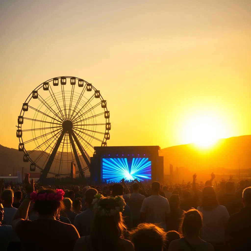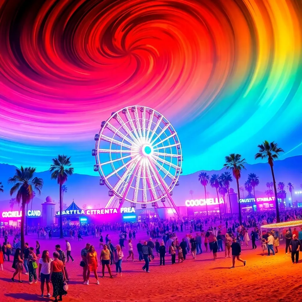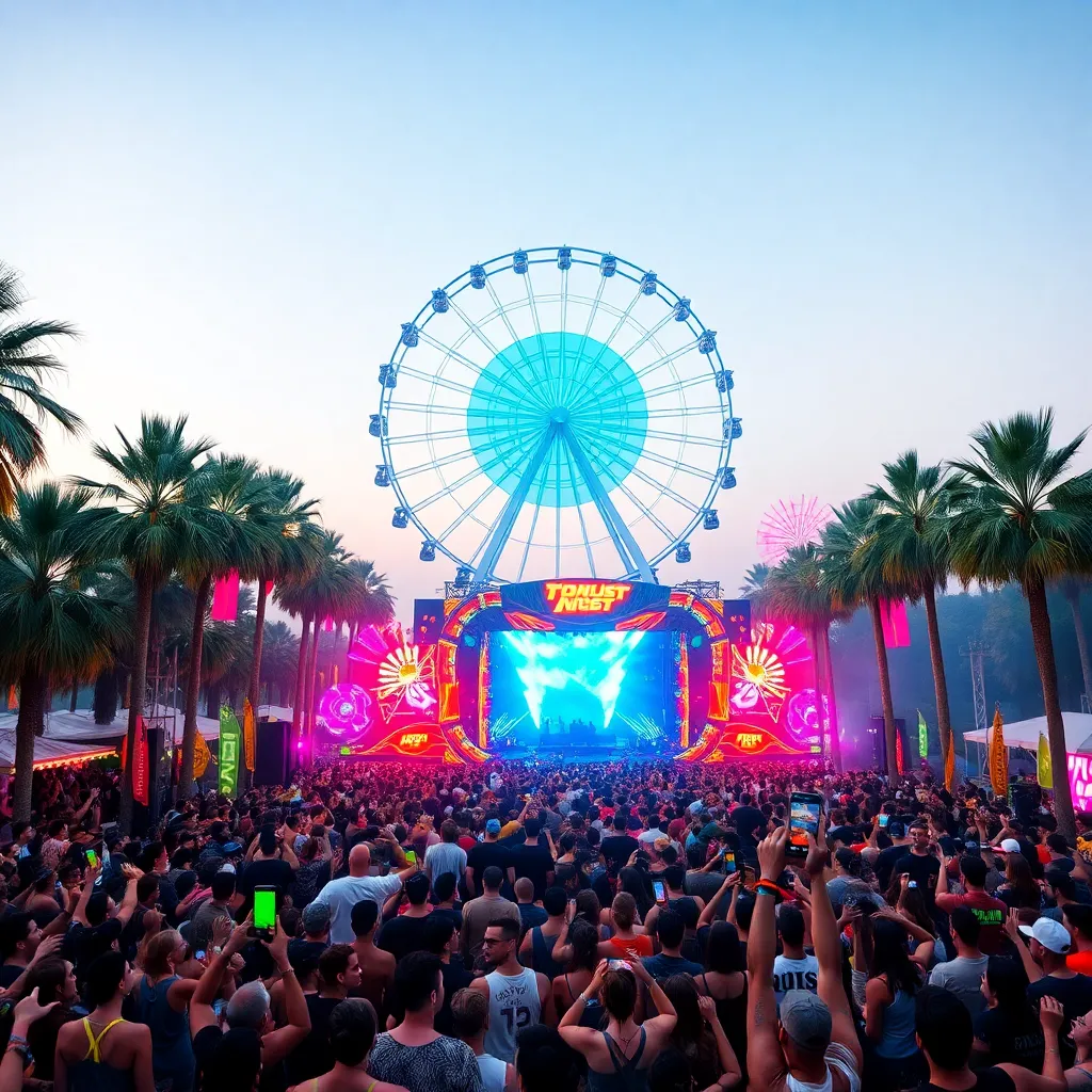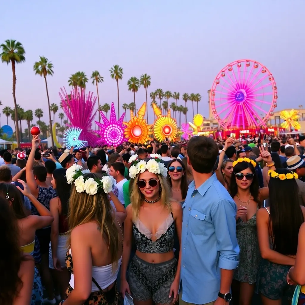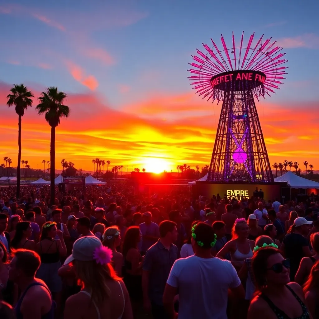 a vibrant desert oasis where music meets art. Imagine a warm sunset backdrop, with a sea of colorful festival-goers dancing in front of a giant stage. Incorporate iconic festival elements like palm trees, flower crowns, and neon-lit wristbands. Create a mesmerizing scene that pulses with energy and creativity.