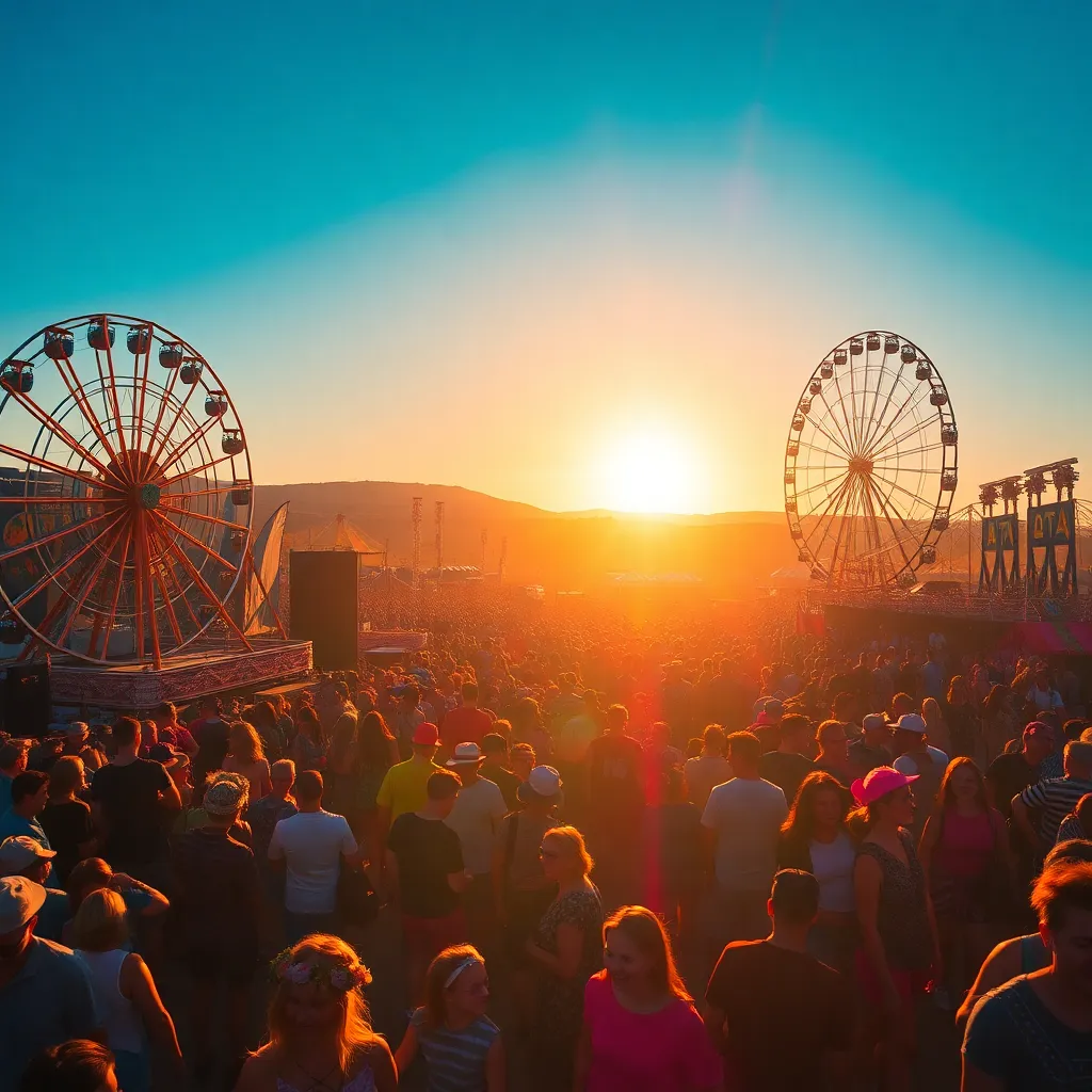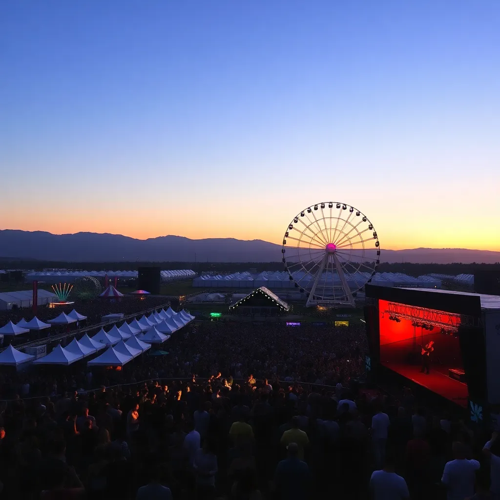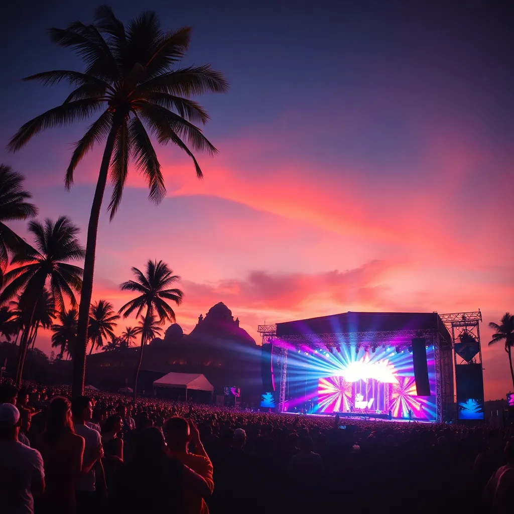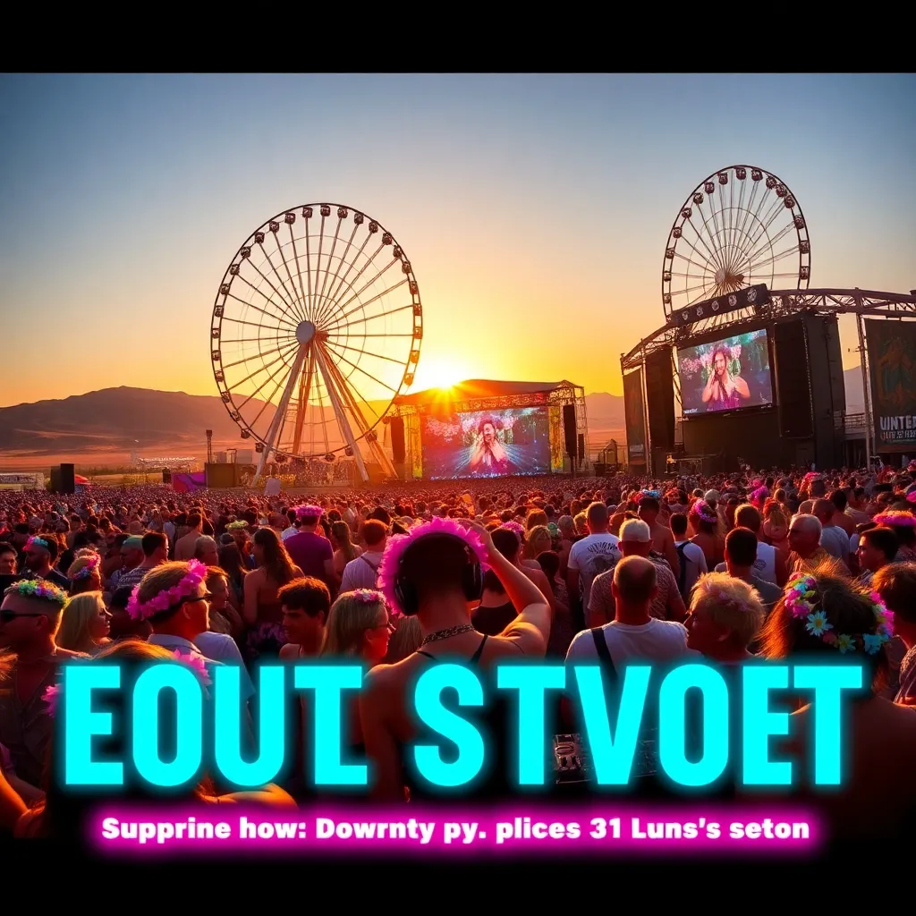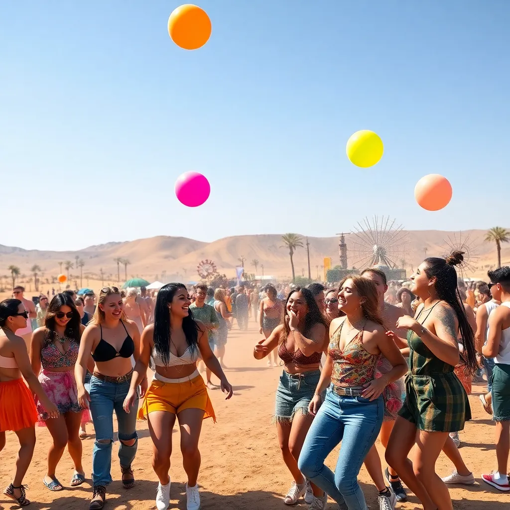 a vibrant desert oasis where music meets art. Imagine a warm sunset backdrop, with a sea of colorful festival-goers dancing in front of a giant stage. Incorporate iconic festival elements like palm trees, flower crowns, and neon-lit wristbands. Create a mesmerizing scene that pulses with energy and creativity.