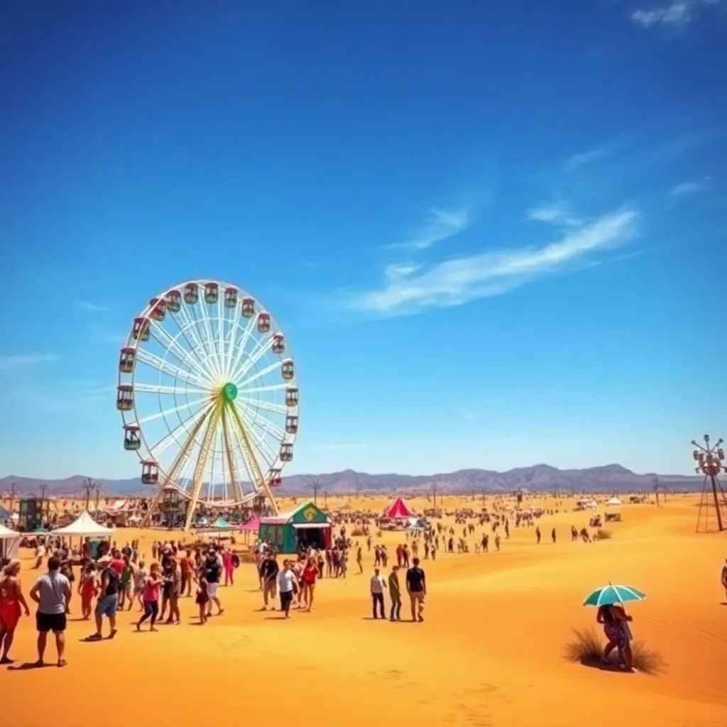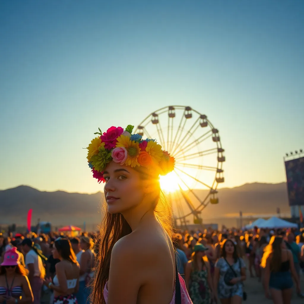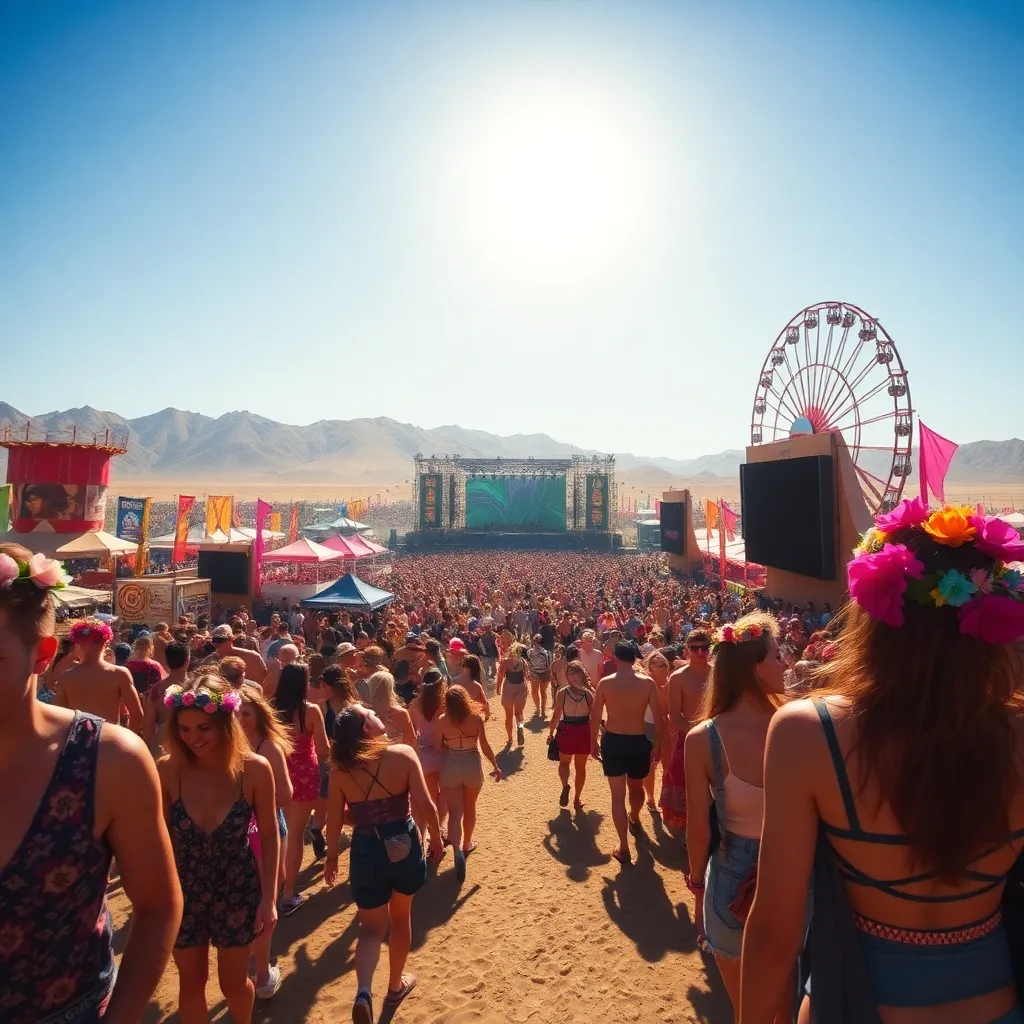 a vibrant desert festival under the scorching California sun. Imagine a sea of flower crowns, trendy outfits, and dancing crowds. Incorporate iconic festival elements like the Ferris wheel, art installations, and the main stage. Convey the excitement, music, and carefree atmosphere of this beloved event.