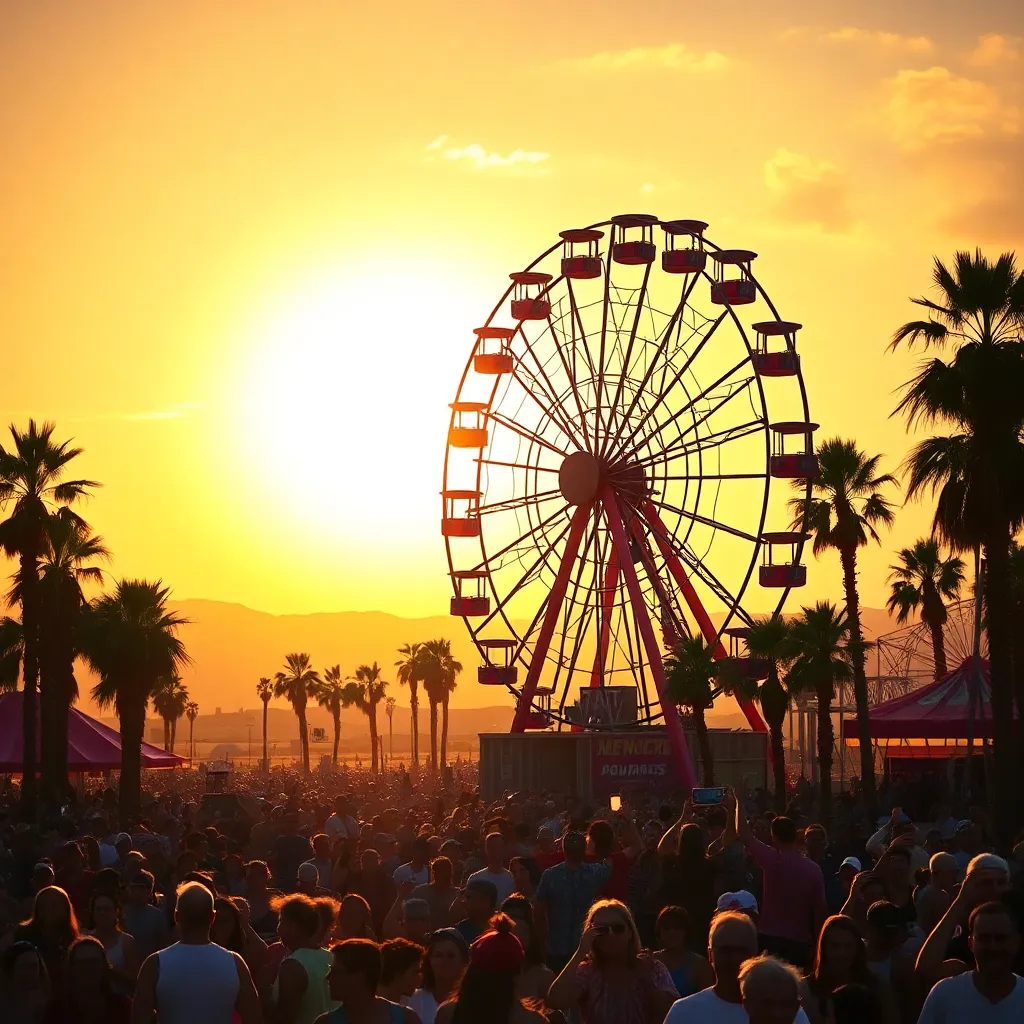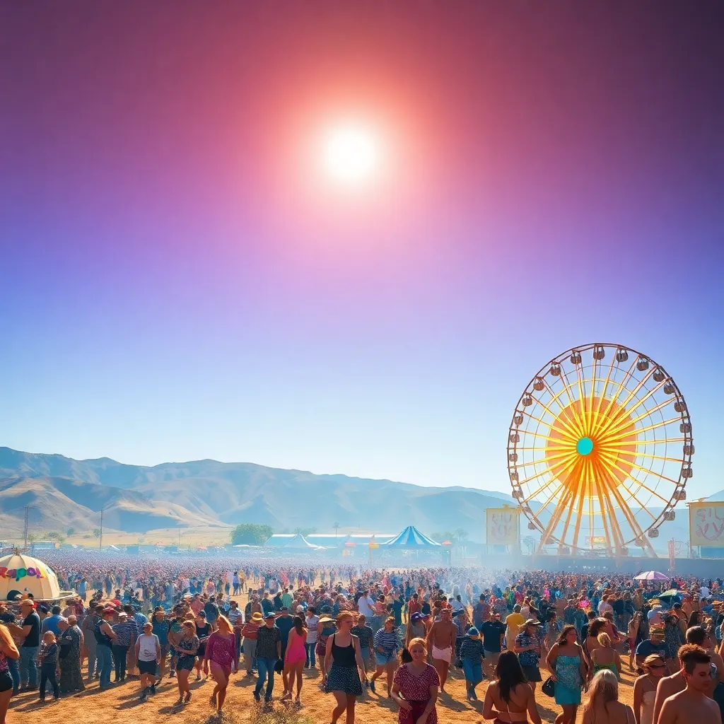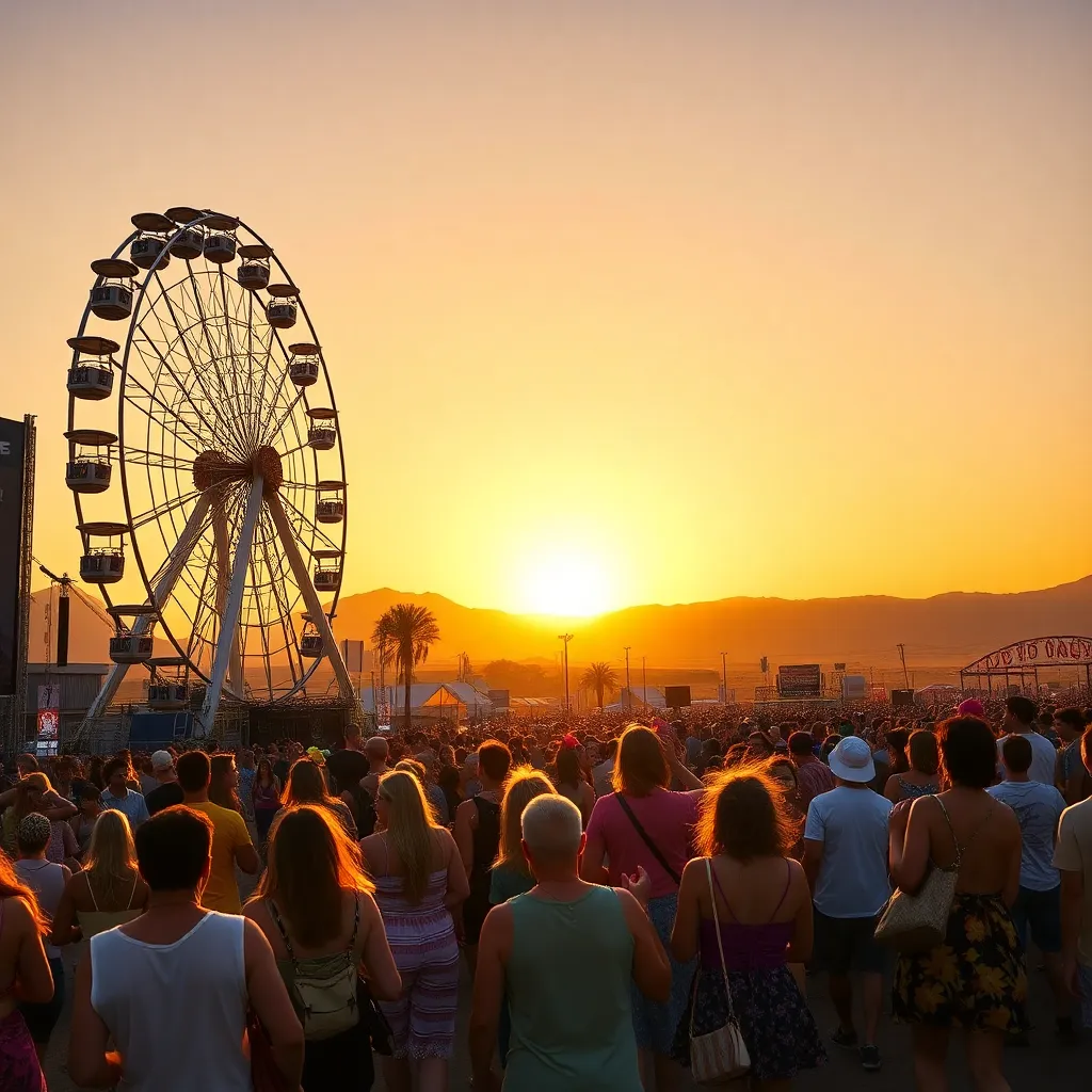a vibrant desert festival under the scorching California sun. Imagine a sea of flower crowns, trendy outfits, and dancing crowds. Incorporate iconic festival elements like the Ferris wheel, art installations, and the main stage. Convey the excitement, music, and carefree atmosphere of this beloved event.