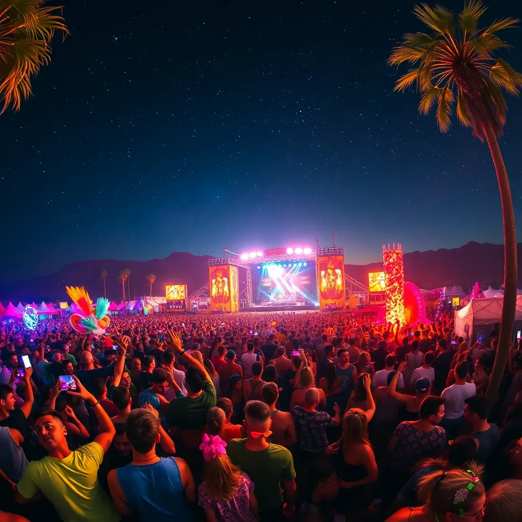 a vibrant, sun-kissed music festival in the California desert. Imagine a sea of colorful festival-goers dancing beneath a starry night sky, surrounded by towering palm trees and majestic stage designs. Incorporate iconic festival elements like flower crowns, glittering costumes, and glowing LED lights.