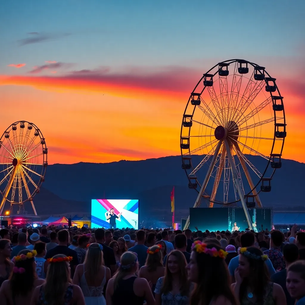Create an AI-generated image of Coachella's main stage at sunset, with a psychedelic-colored Ferris wheel and a sea of festival-goers dancing in front of a giant LED screen displaying a mesmerizing light show. Incorporate a few iconic Coachella fashion statements, such as flower crowns and oversized sunglasses.