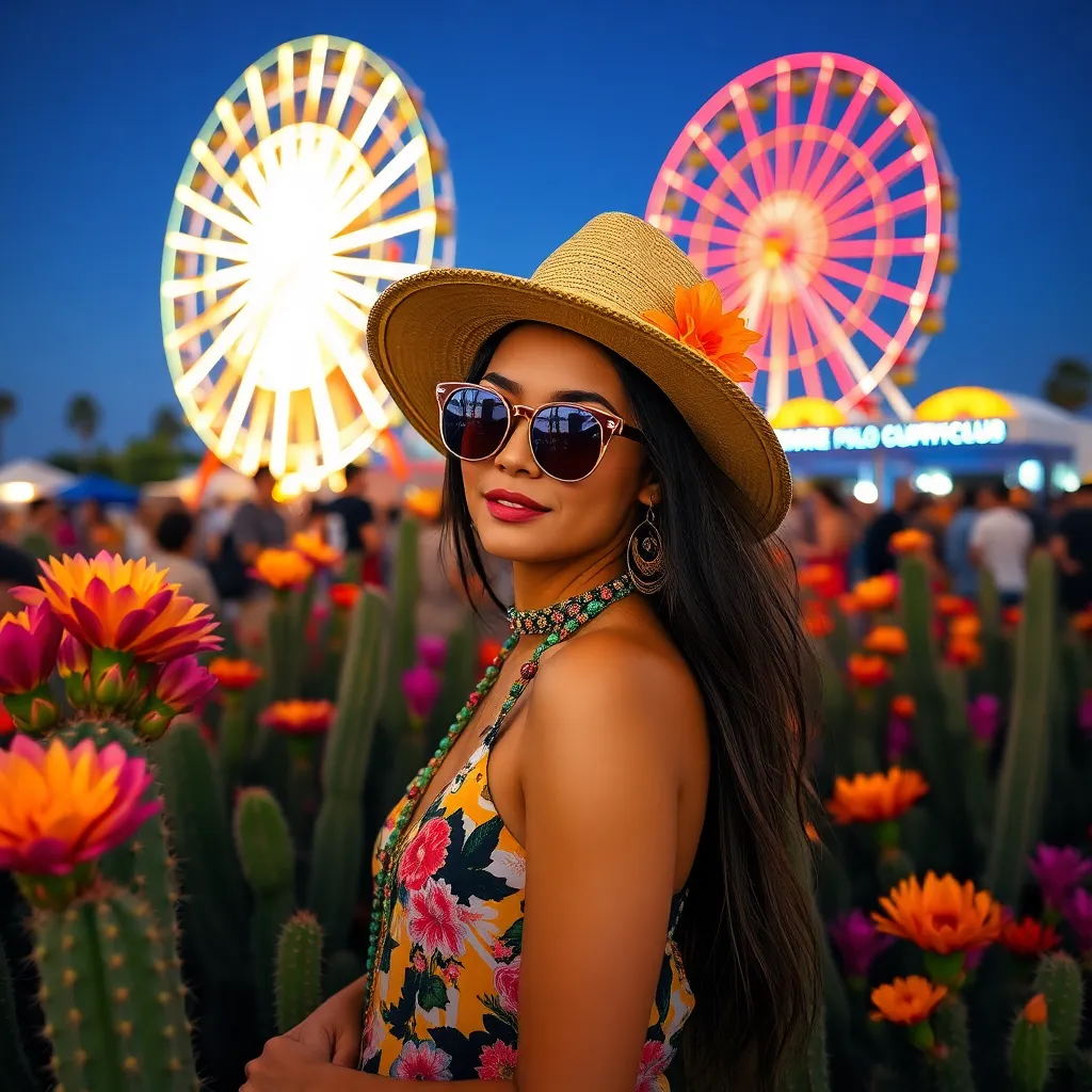 Create a vibrant and eclectic Coachella-inspired image featuring a fusion of bohemian chic and futuristic elements. Incorporate a mix of colors, textures, and patterns, including neon lights, fringe, and florals. Capture the essence of the festival's free-spirited atmosphere, with a majestic Ferris wheel and a sea of dancing festival-goers in the background.