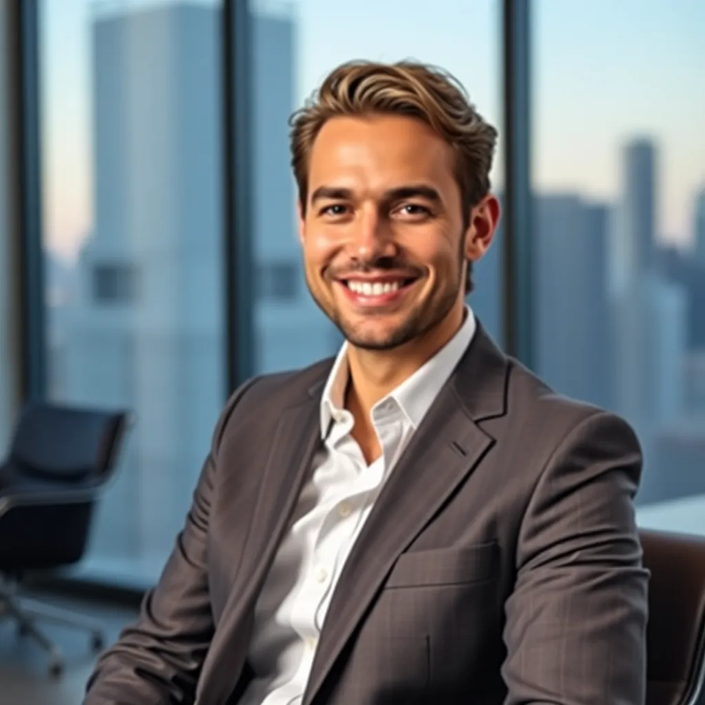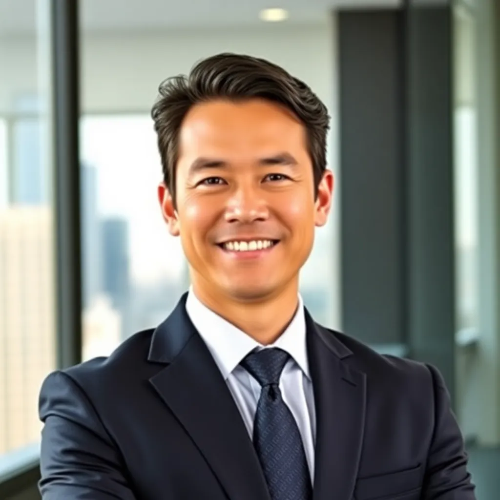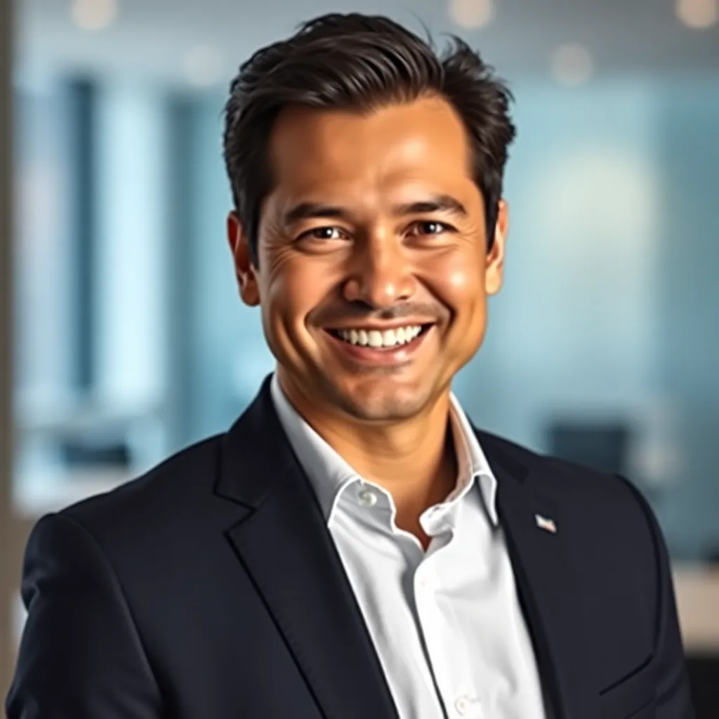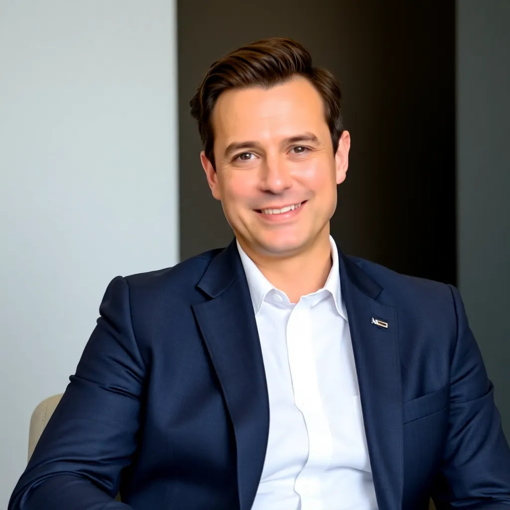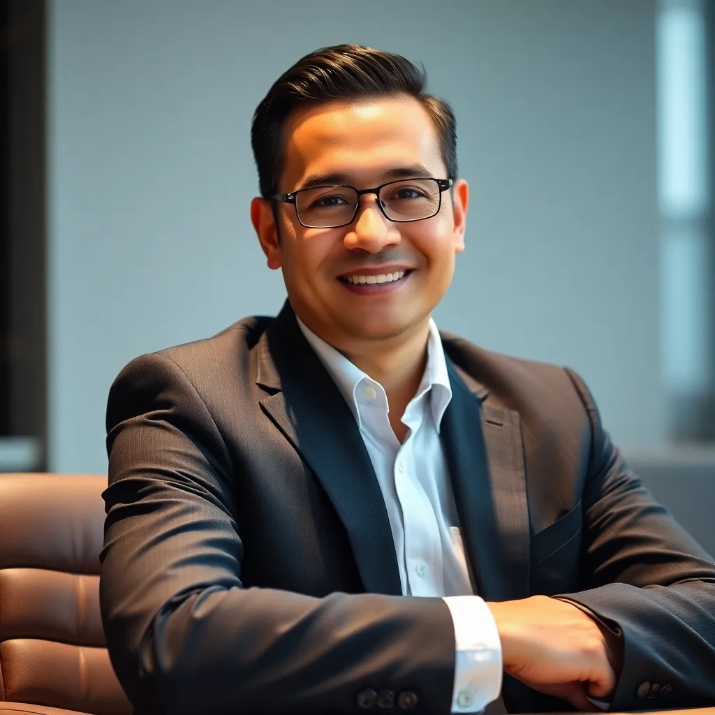 Capture the professional essence of a corporate executive. Imagine a well-dressed individual with a confident smile, sitting in a modern office setting with a subtle background. The lighting is soft and natural, highlighting their sharp features and attire. The mood is serious yet approachable, conveying authority and approachability.