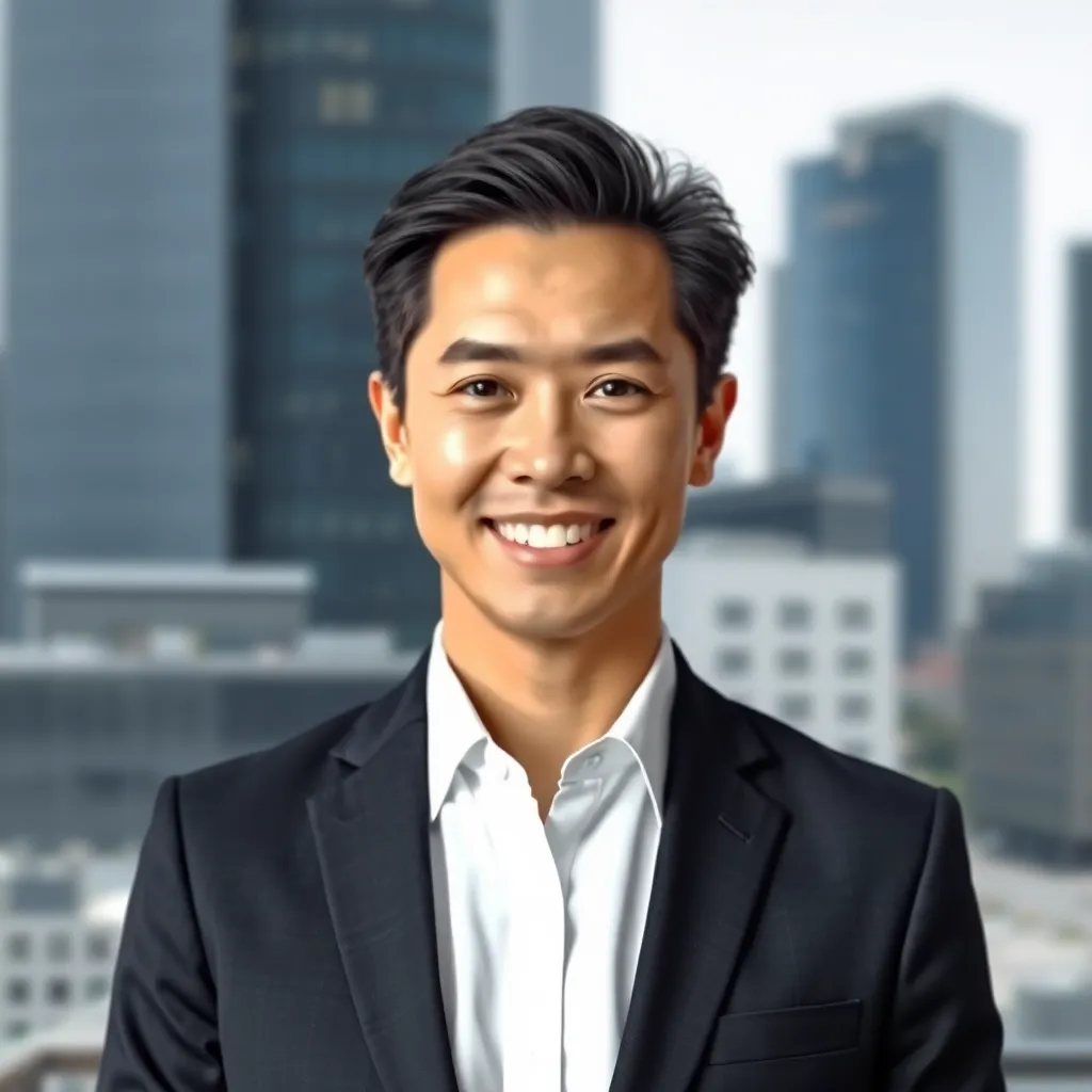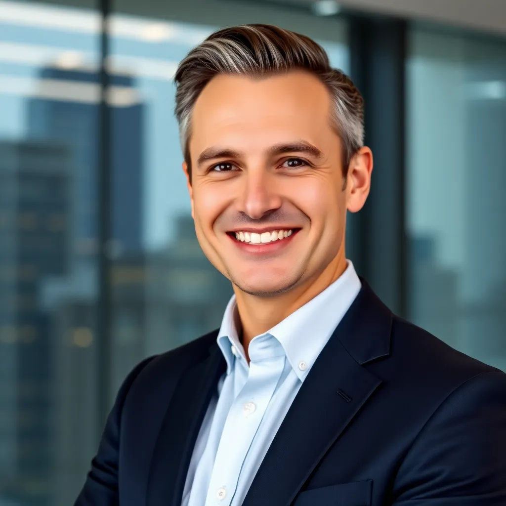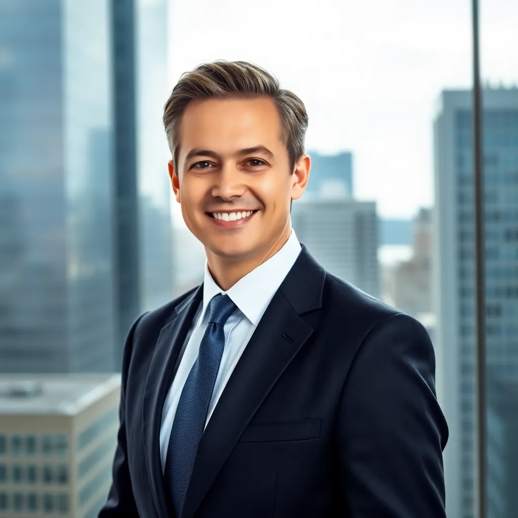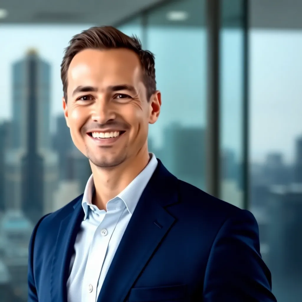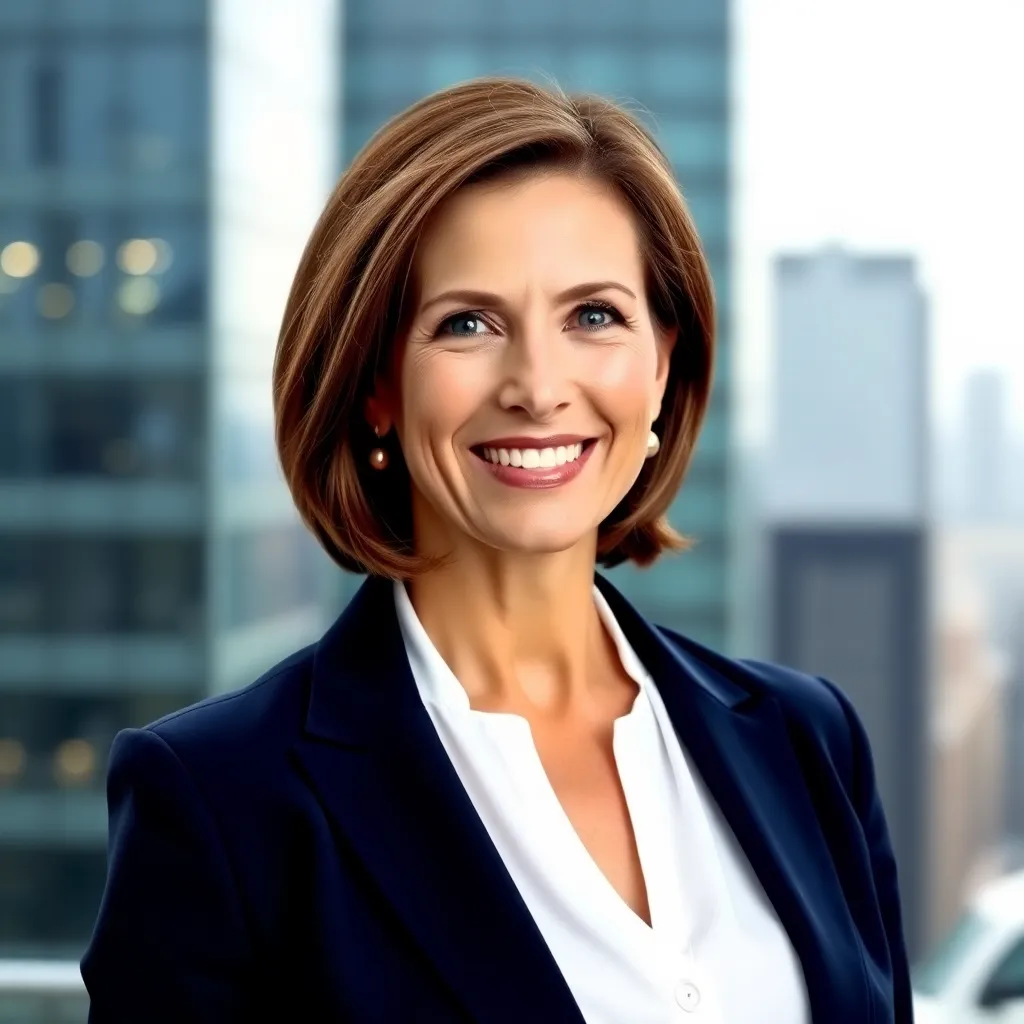 Create a professional corporate headshot of a successful business leader, featuring a confident and approachable individual with a warm smile, dressed in a tailored suit and standing in front of a sleek, modern background with a subtle cityscape or office setting, conveying a sense of trust and authority.