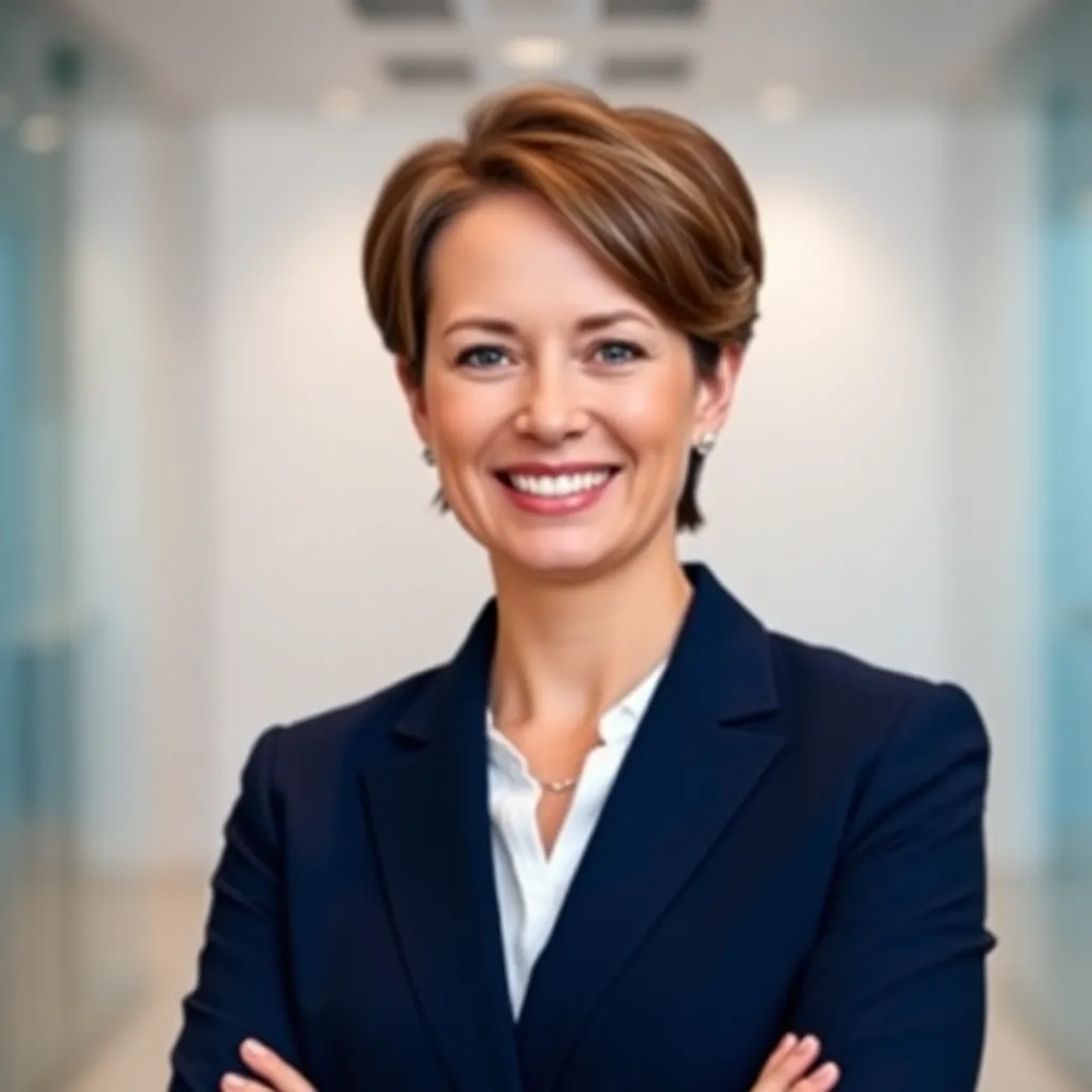 Create a corporate headshot of a professional woman, mid-40s, with short brown hair and a warm smile. She's wearing a crisp white blouse and a tailored navy blue suit, standing in front of a modern office background with a subtle gradient of blues and whites. Make her look confident and approachable.