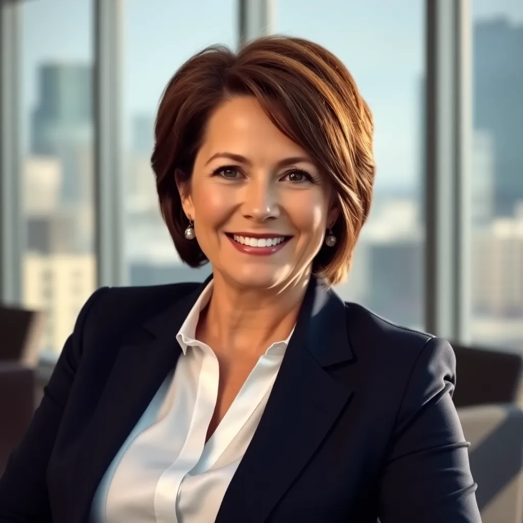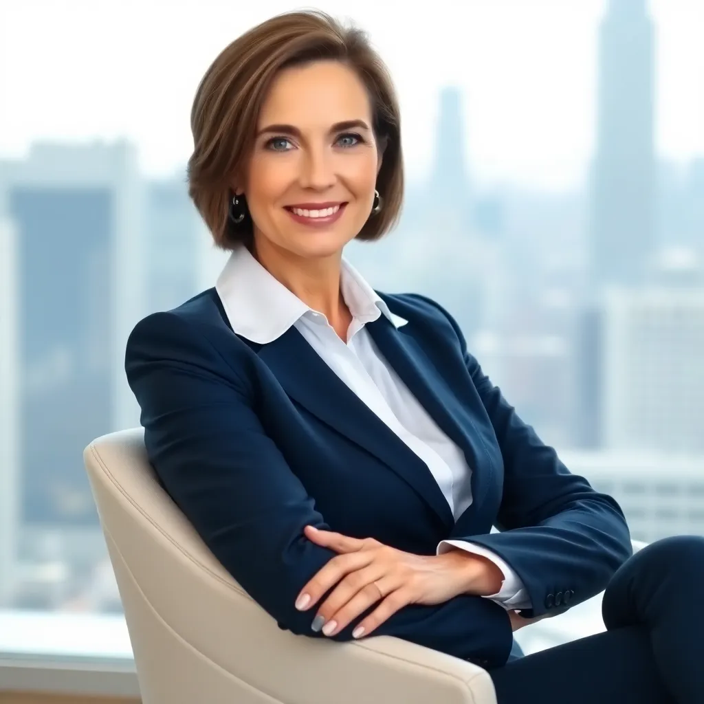 Create a corporate headshot for a successful business leader. The subject is a middle-aged woman with short brown hair, wearing a crisp white blouse and tailored navy blue suit. She's sitting in a modern office with a subtle cityscape background, exuding confidence and professionalism. Capture a warm, natural light.