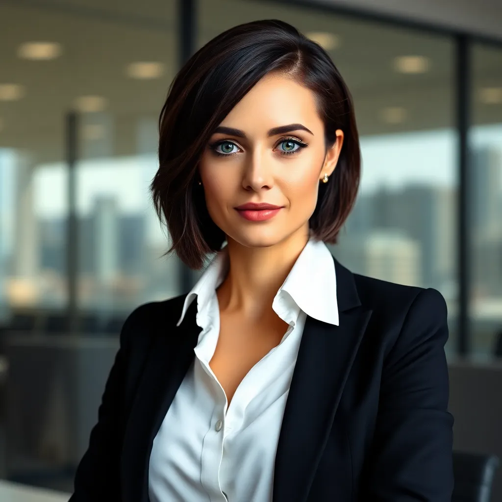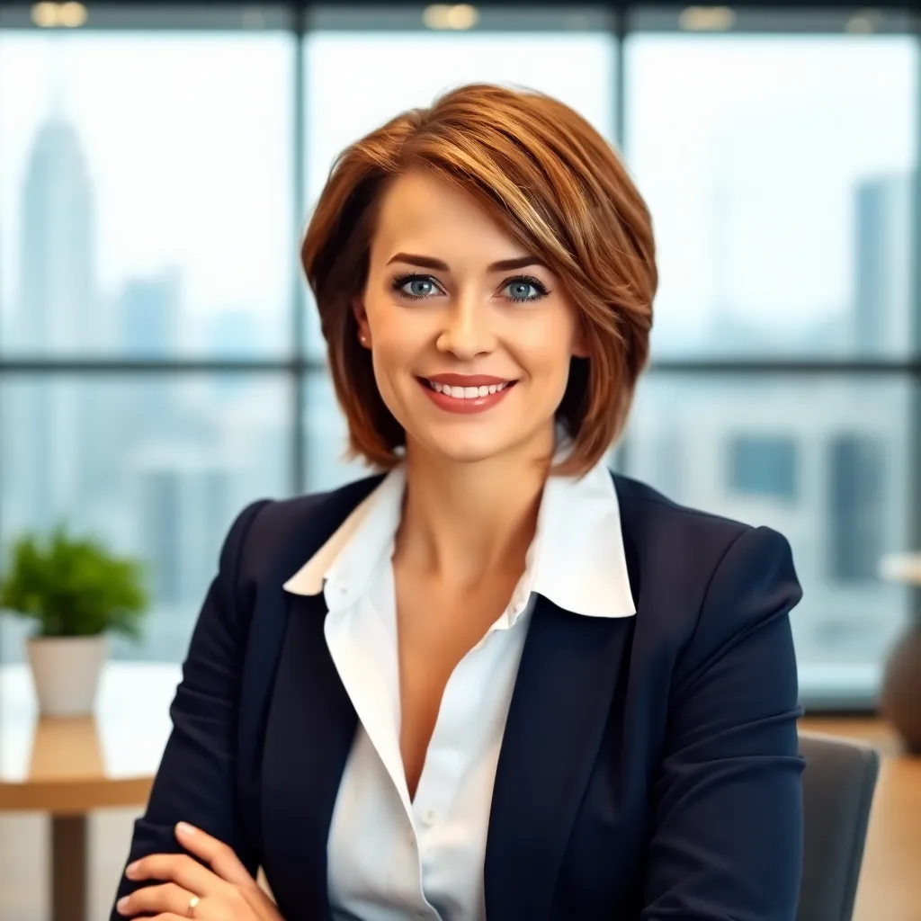 Create a professional corporate headshot of a successful businesswoman, age 35-50, with short brown hair and bright blue eyes. She's wearing a crisp white blouse and a tailored navy blue suit, sitting in a modern office setting with a subtle cityscape background. Exude confidence and authority in her expression.