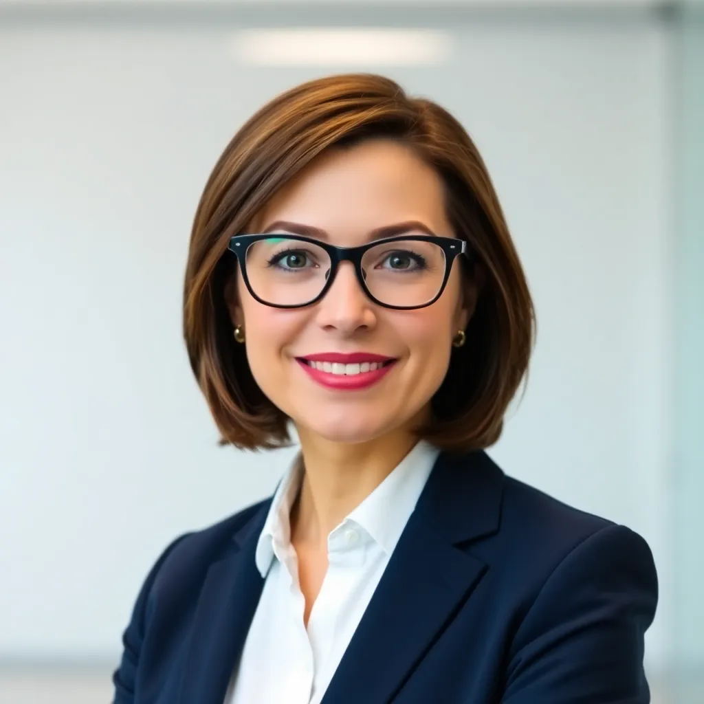 Create a professional corporate headshot for a mid-level executive at a tech startup. The subject is a 35-year-old woman with short brown hair and glasses, wearing a crisp white blouse and a tailored navy blue suit. The background should be a clean, minimalist office space with a subtle gradient effect.