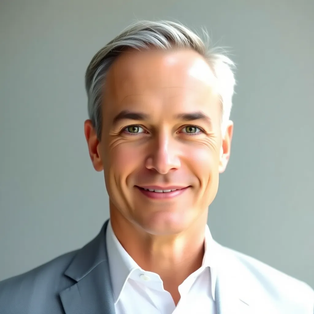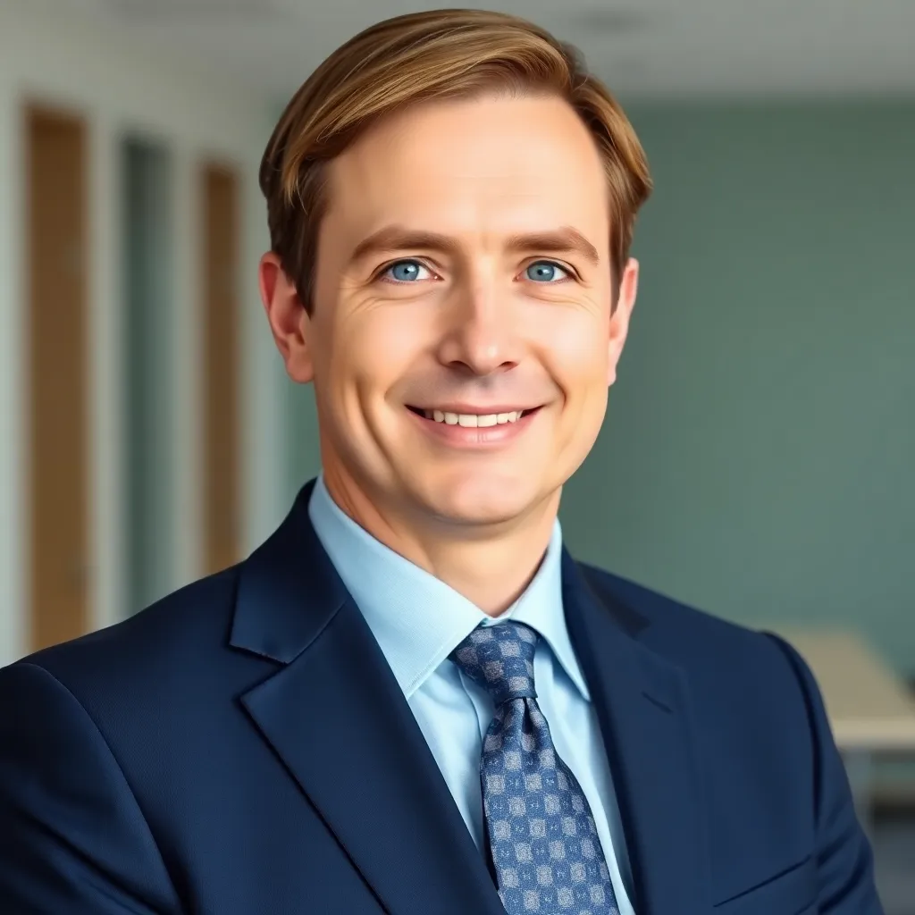 Create a professional corporate headshot of a business leader. The subject is a 45-year-old executive with short brown hair, piercing blue eyes, and a warm smile. They're dressed in a navy blue suit with a crisp white shirt and a subtle patterned tie. The background is a clean, neutral office space.