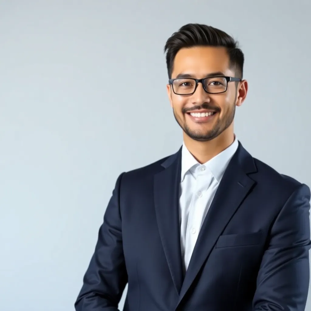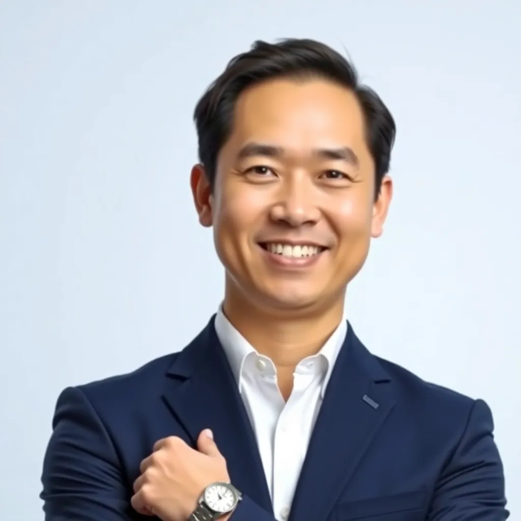 Create a professional corporate headshot for a fictional CEO, 'Alex Chen', a 45-year-old Asian male with short, dark hair and a warm smile. He wears a crisp white dress shirt, dark blue suit, and a simple silver watch. The background is a subtle gradient of blue and white, conveying trust and sophistication.