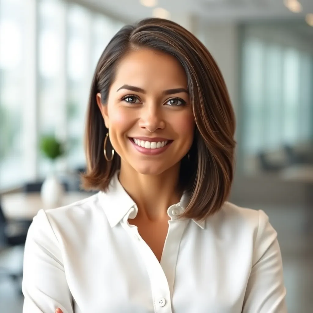 Create a professional corporate headshot of a successful businesswoman, featuring a bright and modern office background, a warm smile, and a confident pose. Her hair is styled in a sleek bob, and she's wearing a crisp white blouse with a subtle pattern. The image should exude trust, authority, and approachability.