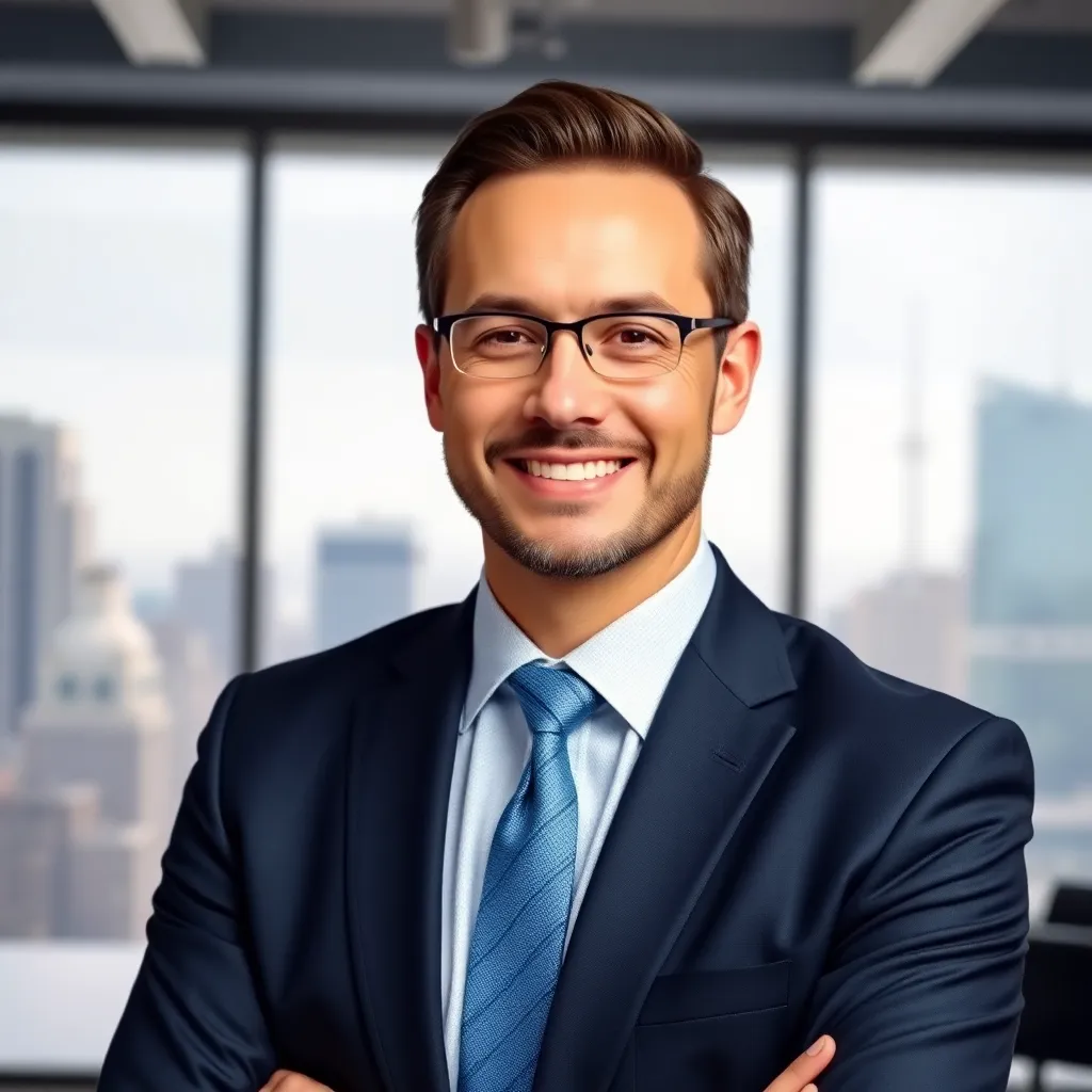 Create a professional corporate headshot of a successful business executive, featuring a confident and approachable individual with a warm smile, dressed in a sharp navy blue suit with a crisp white shirt, standing in front of a modern cityscape or a sleek office background with a subtle gradient effect.