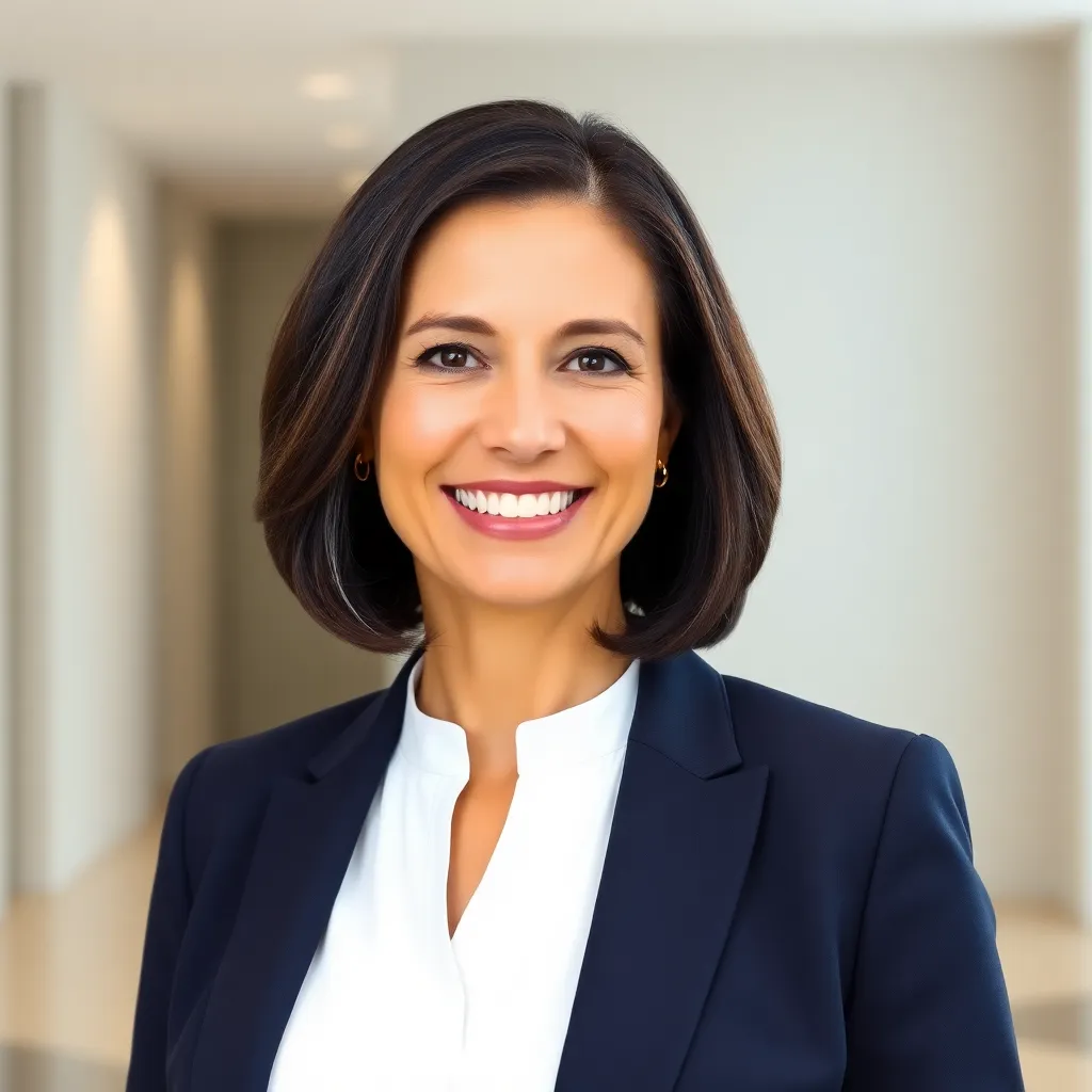 Create a professional corporate headshot of a successful business executive. The subject is a 45-year-old woman with short, dark hair and a warm smile. She's wearing a crisp white blouse and a tailored navy blue suit. The background is a subtle gradient of blues and whites to convey a sense of trust and authority.