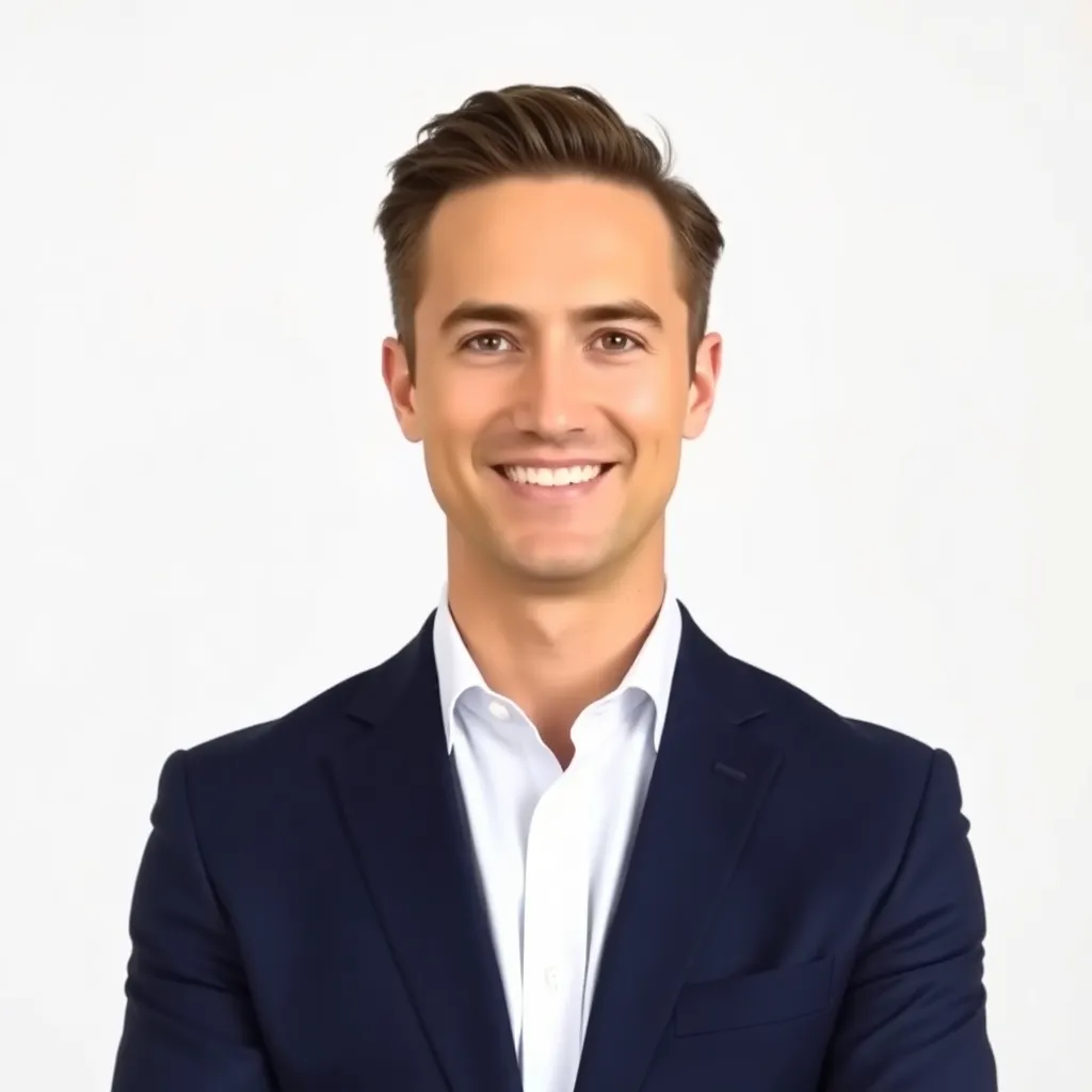 Create a professional corporate headshot of a successful business executive, showcasing a confident and approachable demeanor. The subject is dressed in a crisp, modern suit and standing in front of a clean, minimalist background with a subtle gradient of blues and whites to convey trust and sophistication.
