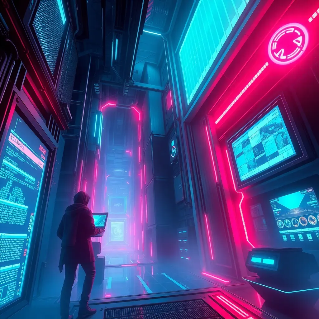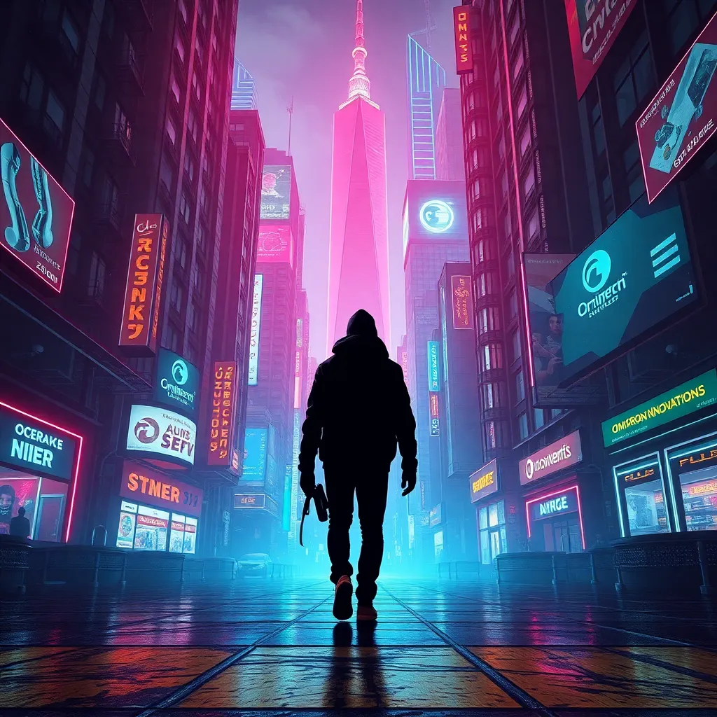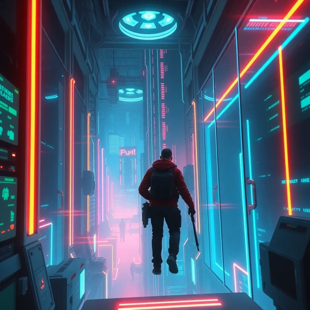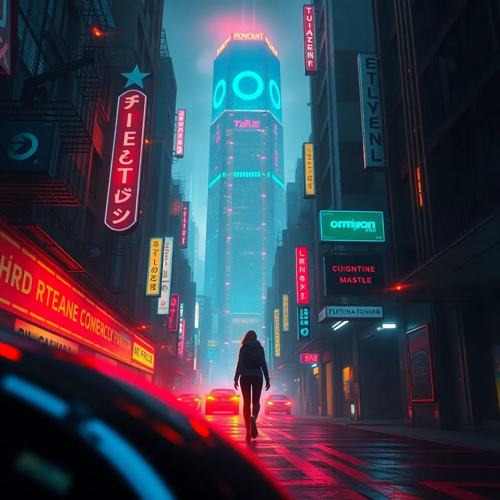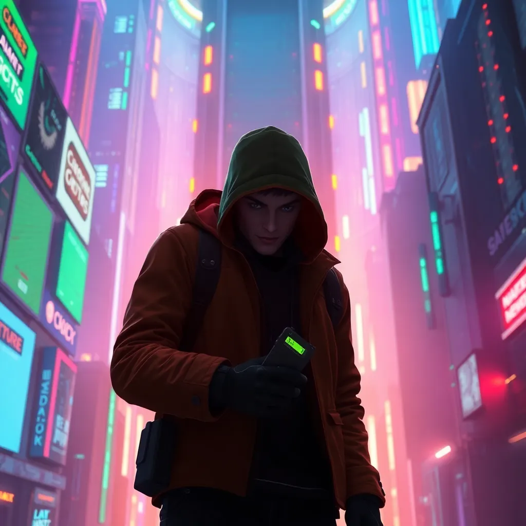 In the neon-drenched sprawl of New Eden, a lone hacker, Kael, infiltrates the corporate tower of Omicron Innovations to steal the latest AI upgrade. But as they navigate the labyrinthine corridors, they're confronted by the tower's ruthless security forces and a mysterious AI entity with a mind of its own.