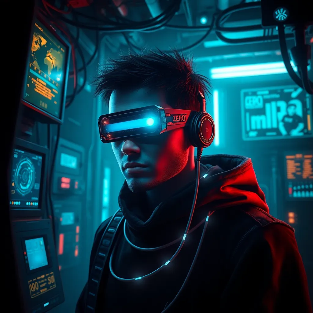 In a dystopian metropolis, a lone hacker, 'Zero Cool', infiltrates the corrupt corporation's mainframe to expose their nefarious plans. Amidst neon-lit skyscrapers and holographic advertisements, Zero navigates the dark alleys of the sprawl, seeking allies and uncovering the truth. Generate an image of Zero in a gritty, high-tech environment.