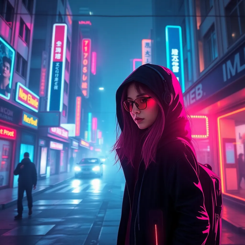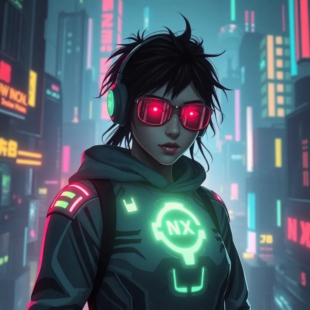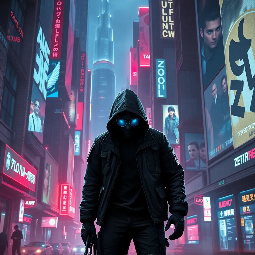 In the neon-drenched streets of New Eden, a lone hacker, 'Zero Cool', infiltrates the corrupt Megacorp's mainframe to expose their sinister plans. Amidst the chaos, a mysterious figure emerges from the shadows, their cybernetic enhancements glowing with an otherworldly blue light. What secrets will they uncover?