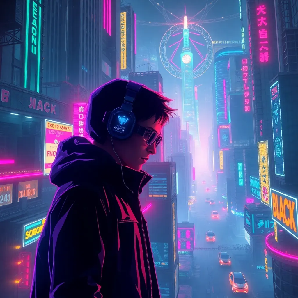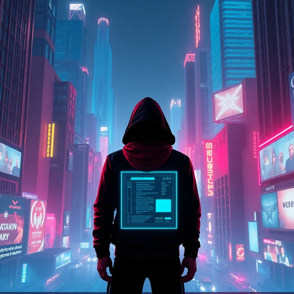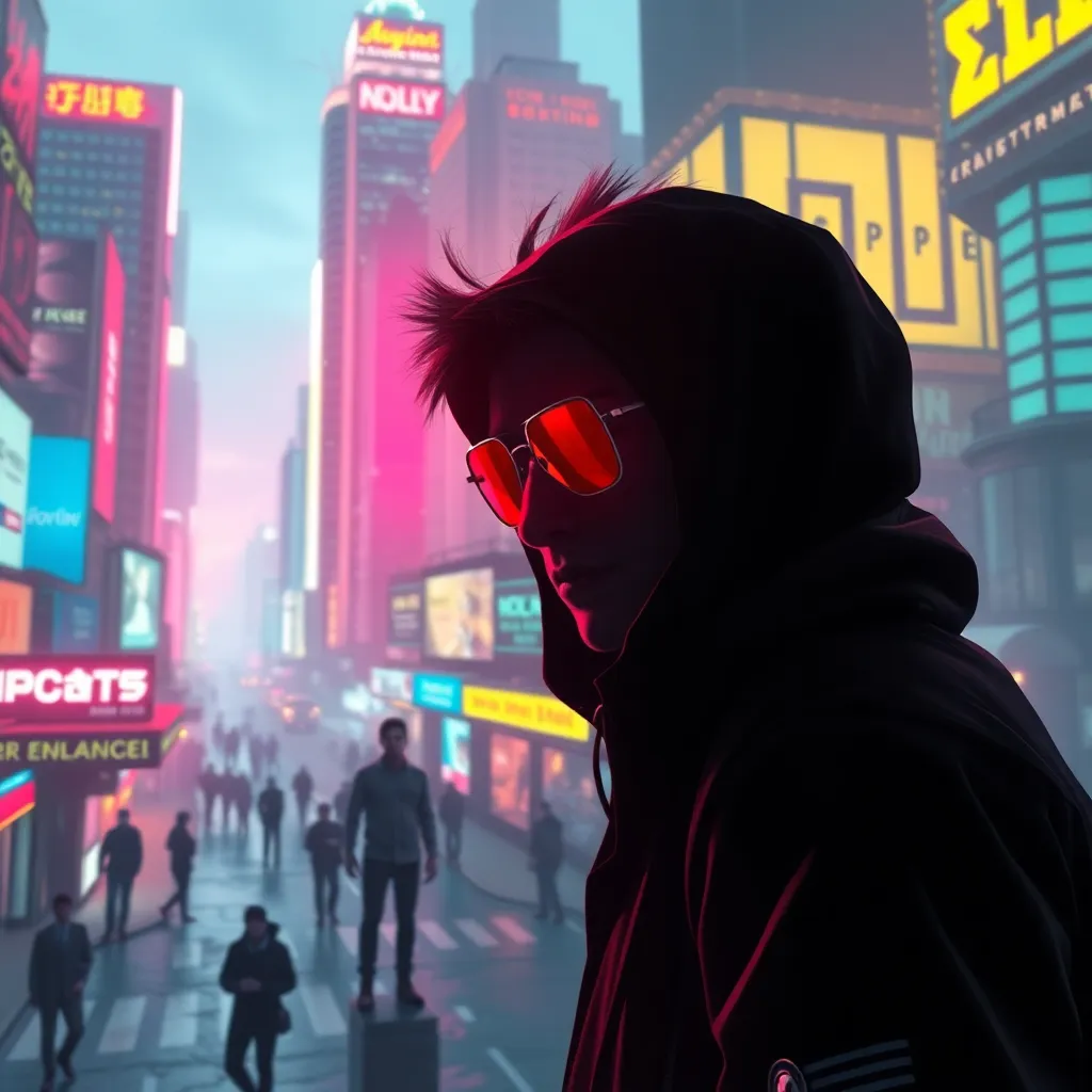 In the neon-drenched streets of New Eden, a lone hacker, 'Zero Cool', infiltrates the corrupt Megacorp's mainframe to expose their sinister plans. Amidst the chaos, a mysterious figure emerges from the shadows, their cybernetic enhancements glowing with an otherworldly blue light. What secrets will they uncover?