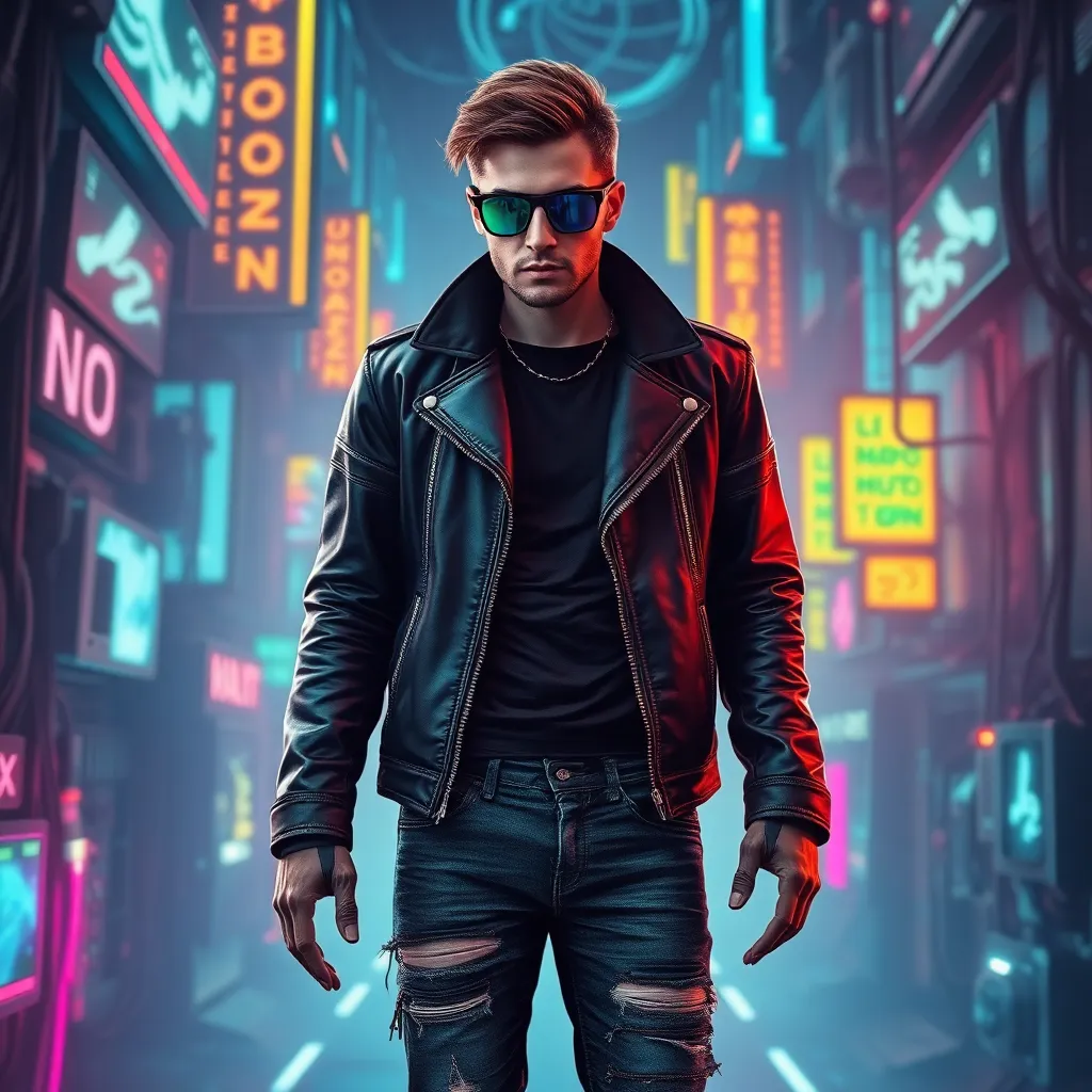 In the neon-drenched sprawl of New Eden, a lone hacker, 'Zero Cool', infiltrates the corrupt megacorp, Omicron Innovations, to uncover the truth behind their latest mind-control implant. Generate an image of Zero, dressed in a black leather jacket and ripped jeans, surrounded by wires and holographic screens.