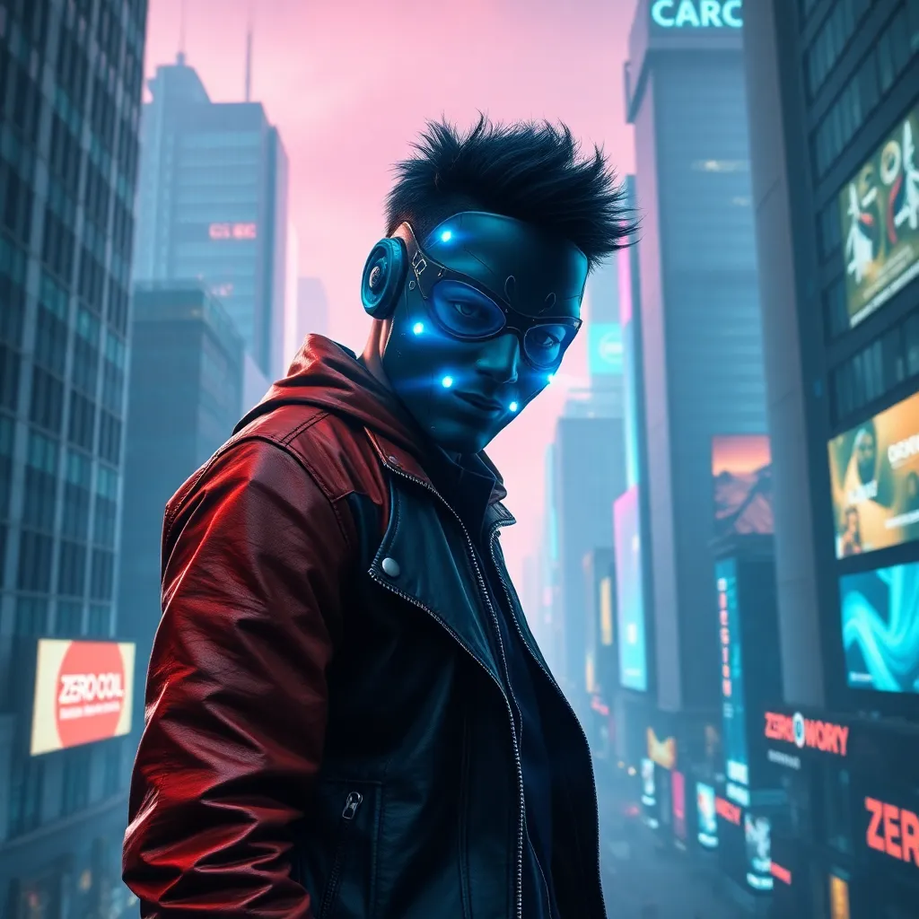 In the neon-drenched sprawl of Neo-Eden, a lone hacker, 'Zero Cool', infiltrates the corrupt corporation, Omicron Innovations, to uncover the truth behind their latest mind-control chip. Generate an image of Zero Cool, a cyber-enhanced individual with a mask, leather jacket, and glowing blue circuits, amidst a cityscape of towering skyscrapers and holographic advertisements.