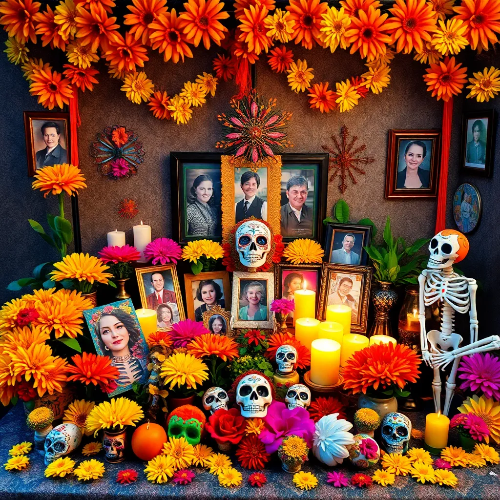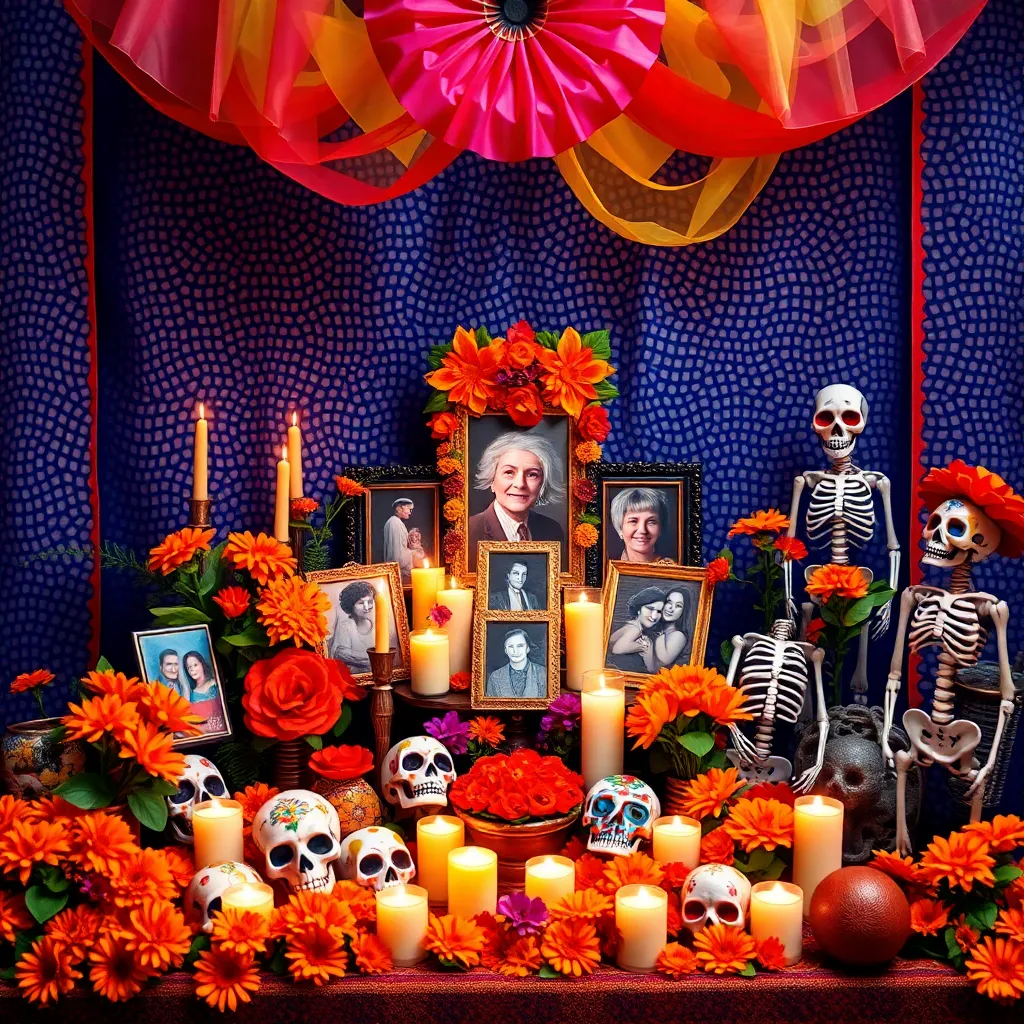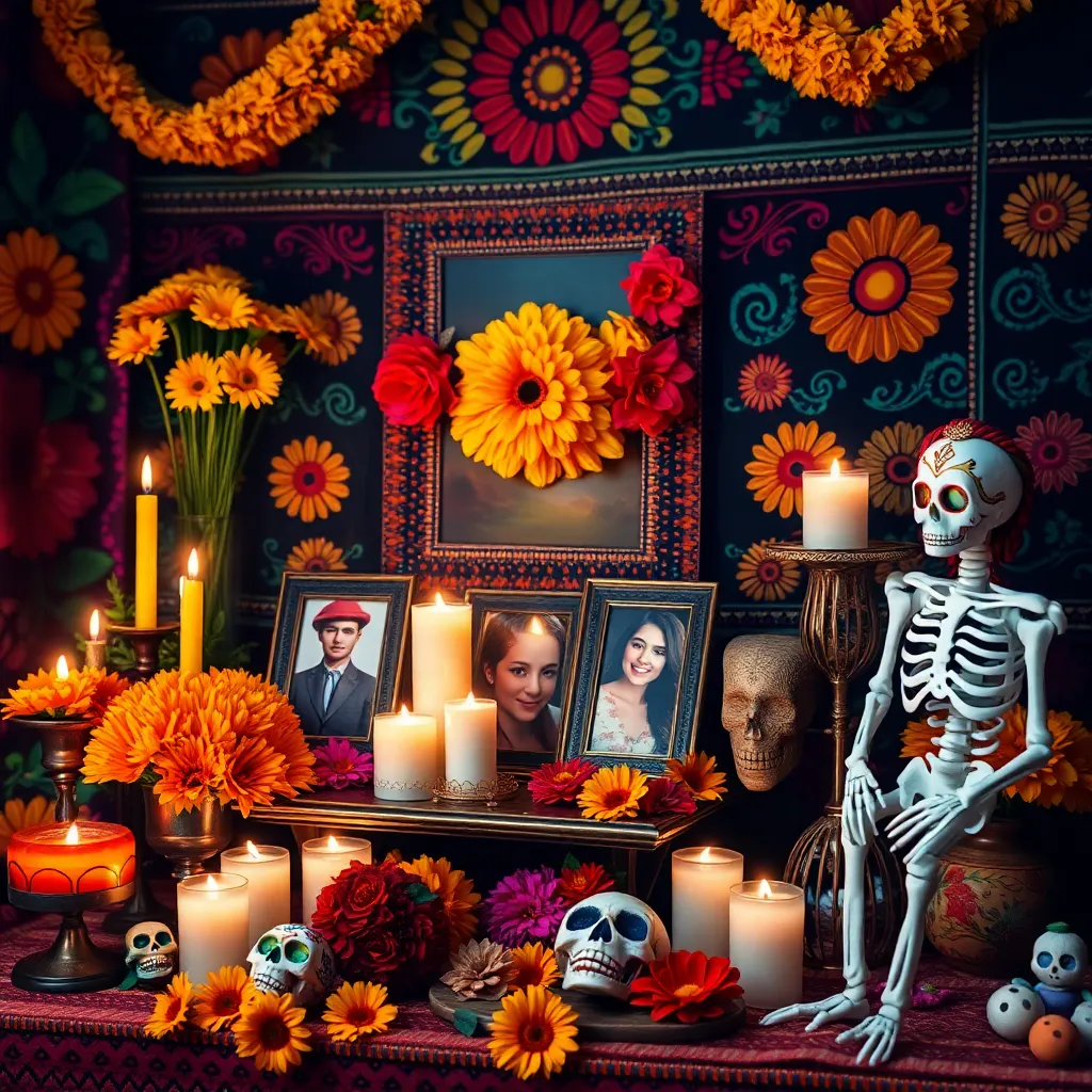 Create an AI-generated image celebrating the vibrant culture of Dia de los Muertos. Depict a colorful altar adorned with marigolds, candles, and photographs of loved ones. Incorporate sugar skulls, papier-mâché skeletons, and traditional Mexican textiles. Capture the essence of remembrance, celebration, and connection with the dearly departed.
