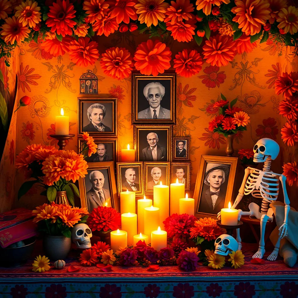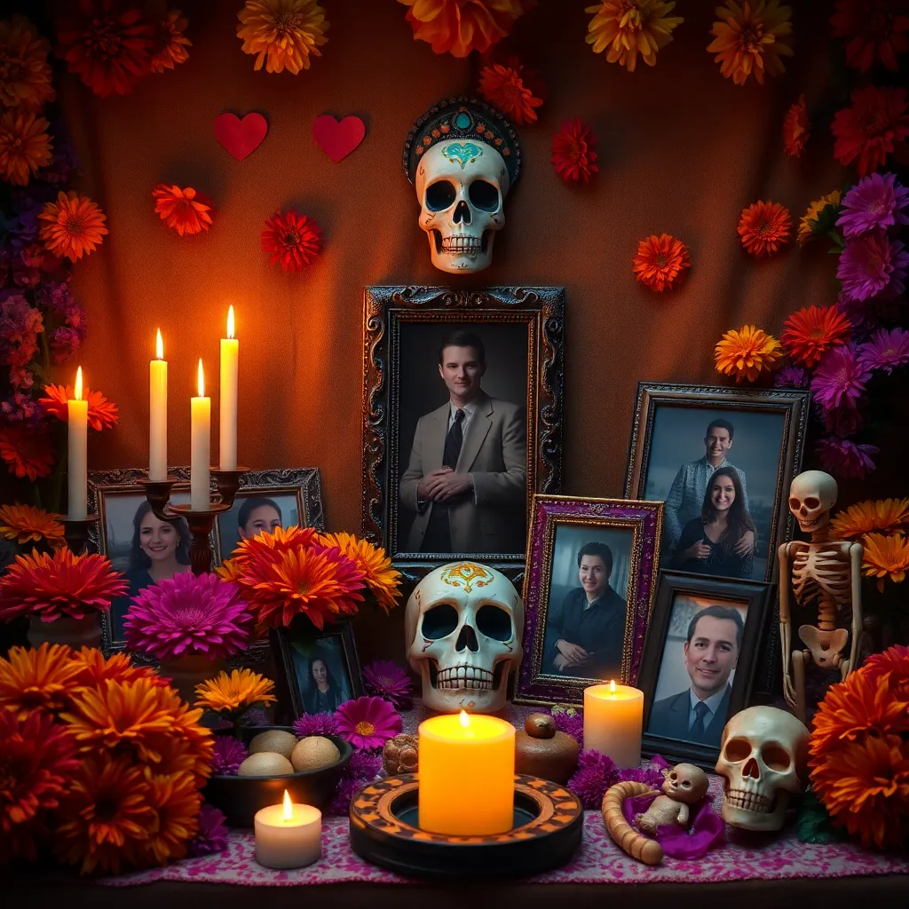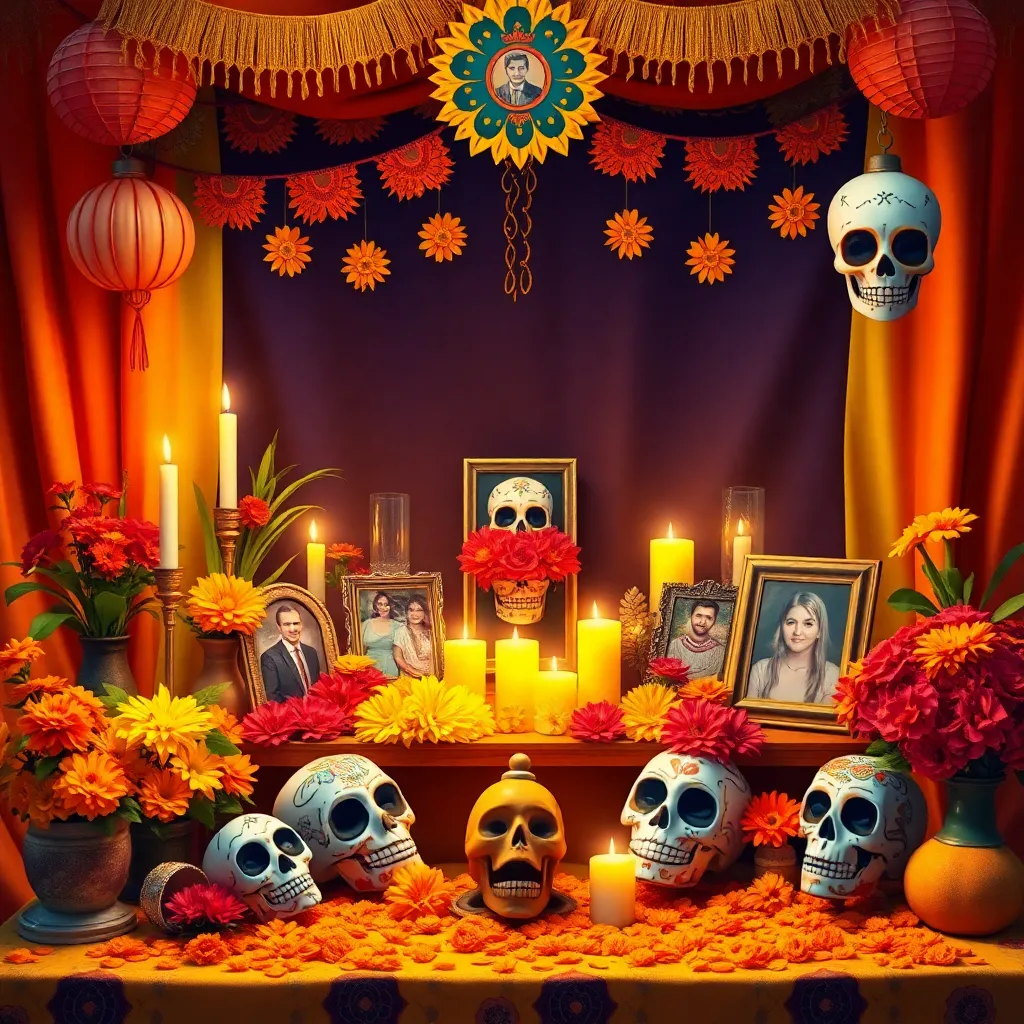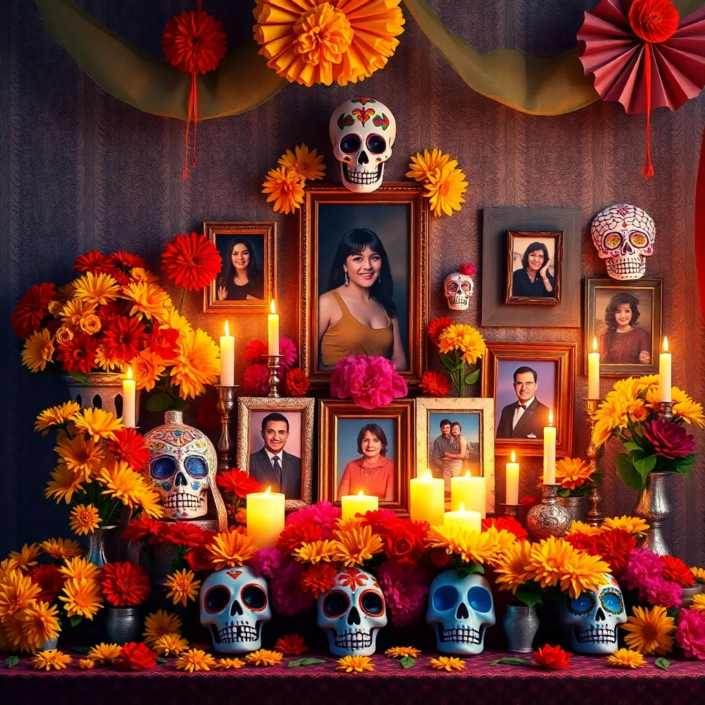 Create an AI-generated image celebrating the vibrant culture of Dia de los Muertos. Depict a colorful altar adorned with marigolds, candles, and photographs of loved ones. Incorporate sugar skulls, papier-mâché skeletons, and traditional Mexican textiles. Capture the essence of remembrance, celebration, and connection with the dearly departed.