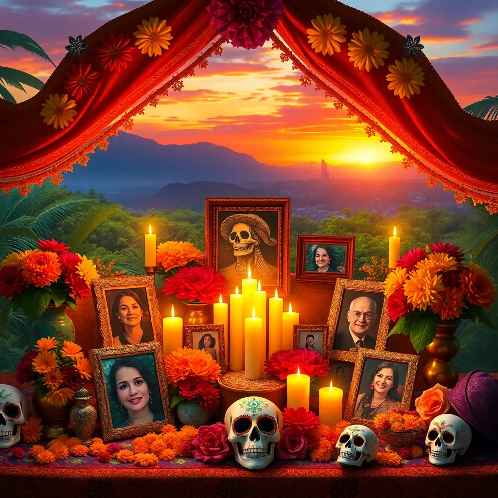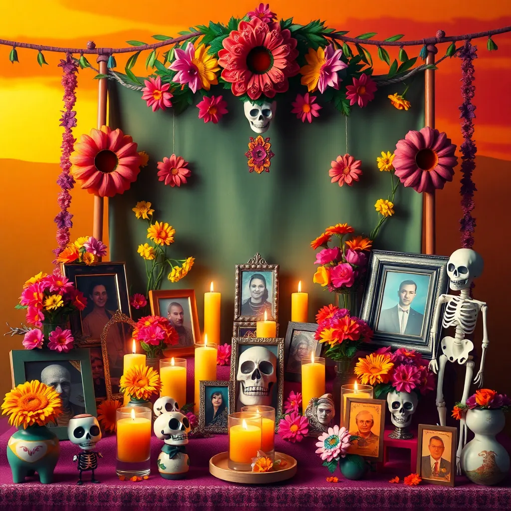 Create a vibrant AI image depicting a traditional Mexican altar for Dia de los Muertos, featuring colorful flowers, candles, and photographs of loved ones who have passed. Incorporate symbolic elements like sugar skulls, marigolds, and papier-mâché skeletons, set against a warm, sunset-hued backdrop, evoking a sense of nostalgia and celebration.
