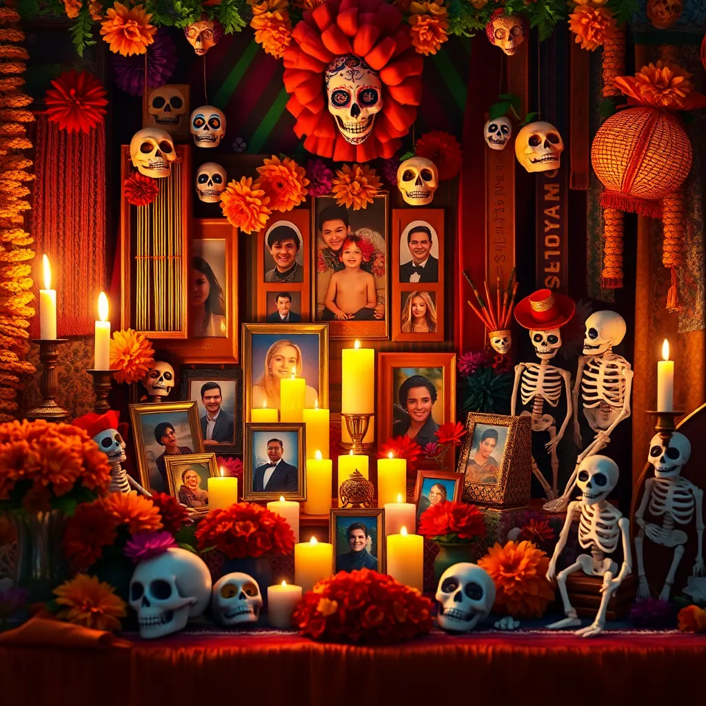 Create an AI image that captures the vibrant spirit of Dia de los Muertos. Depict a colorful altar adorned with marigolds, candles, and photographs of loved ones. Incorporate traditional Mexican elements like sugar skulls, papier-mâché skeletons, and a warm, golden light. Convey the celebration of life and remembrance.
