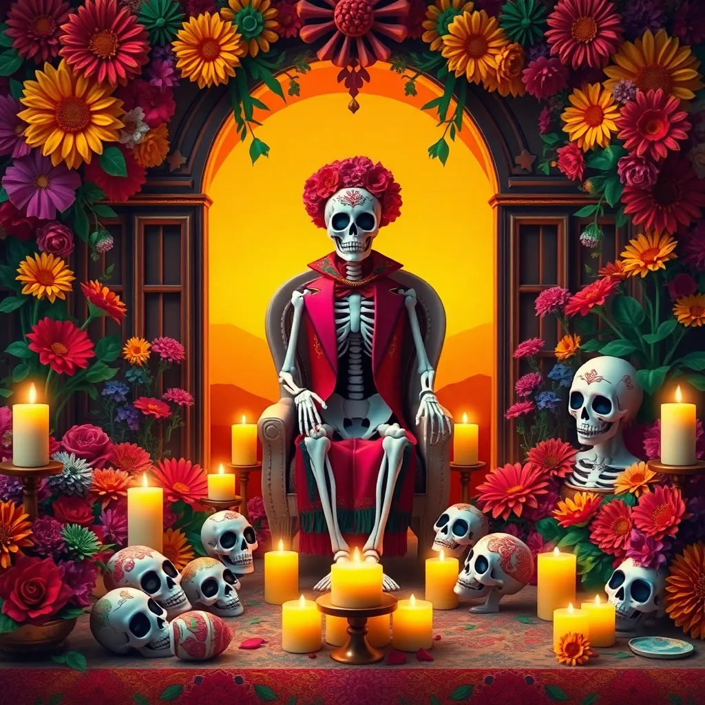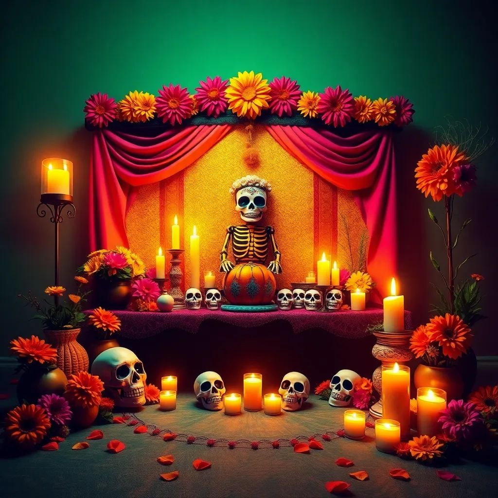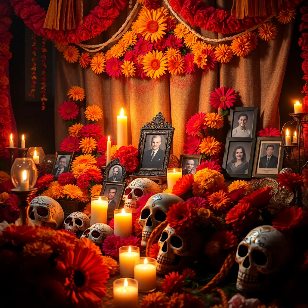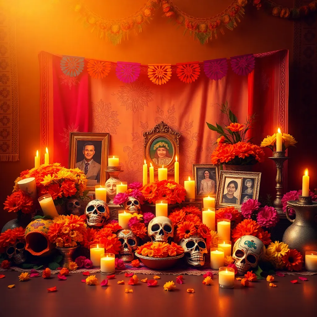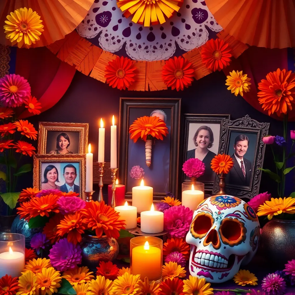 Create a vibrant AI image celebrating the Day of the Dead (Día de los Muertos). Depict a festive altar adorned with colorful flowers, candles, and traditional offerings. Incorporate sugar skulls, marigolds, and a warm, golden glow. Add a sense of nostalgia and remembrance, honoring loved ones who have passed on.