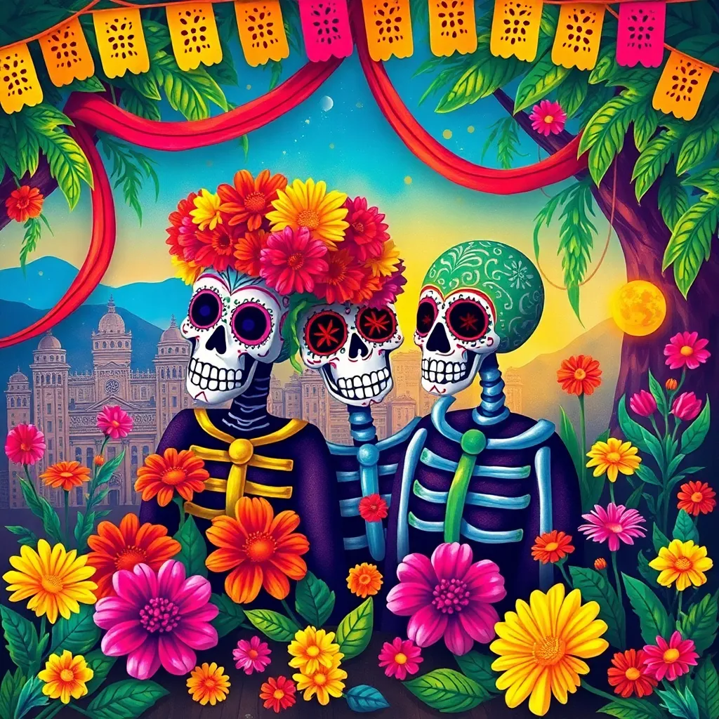 Create a vibrant and colorful AI image depicting a festive Day of the Dead (Día de los Muertos) scene. Incorporate traditional Mexican elements such as sugar skulls, marigolds, and papel picado. Include a vibrant background with a cityscape or a lush jungle. Add a sprinkle of magic and whimsy to make it truly unique.