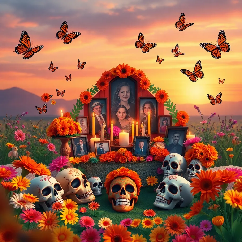 Create an AI-generated image that captures the vibrant spirit of Dia de los Muertos. Depict a colorful altar adorned with marigolds, candles, and photographs of loved ones, surrounded by a whimsical gathering of sugar skulls, paper flowers, and fluttering monarch butterflies, set against a warm, sunset-hued backdrop.