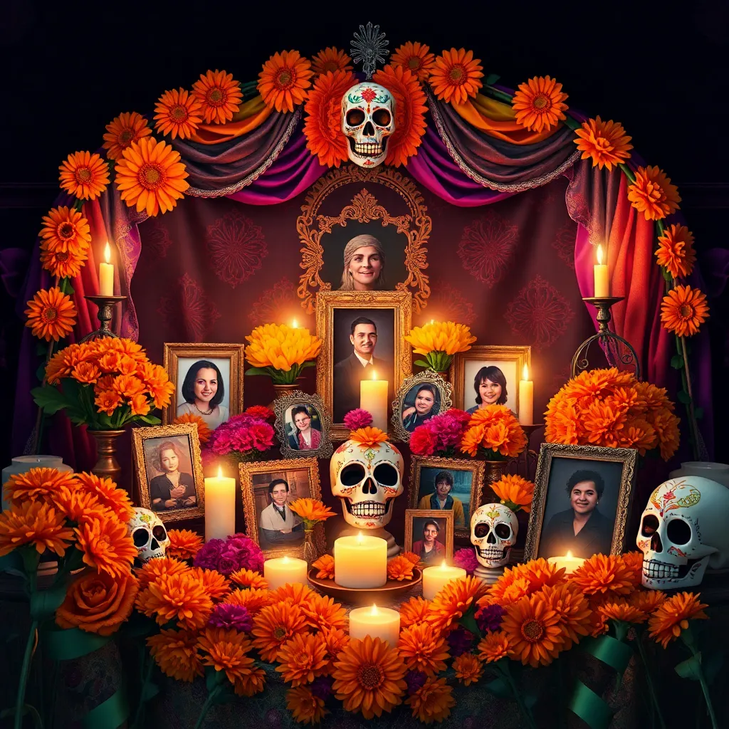 Create an eerie yet vibrant AI image for Day of the Dead (Día de los Muertos). Depict a grandiose, colorful altar adorned with candles, marigolds, and photographs of loved ones. Incorporate sugar skulls, papier-mâché skeletons, and intricate textiles. Capture the essence of honoring the deceased with a touch of mystique.