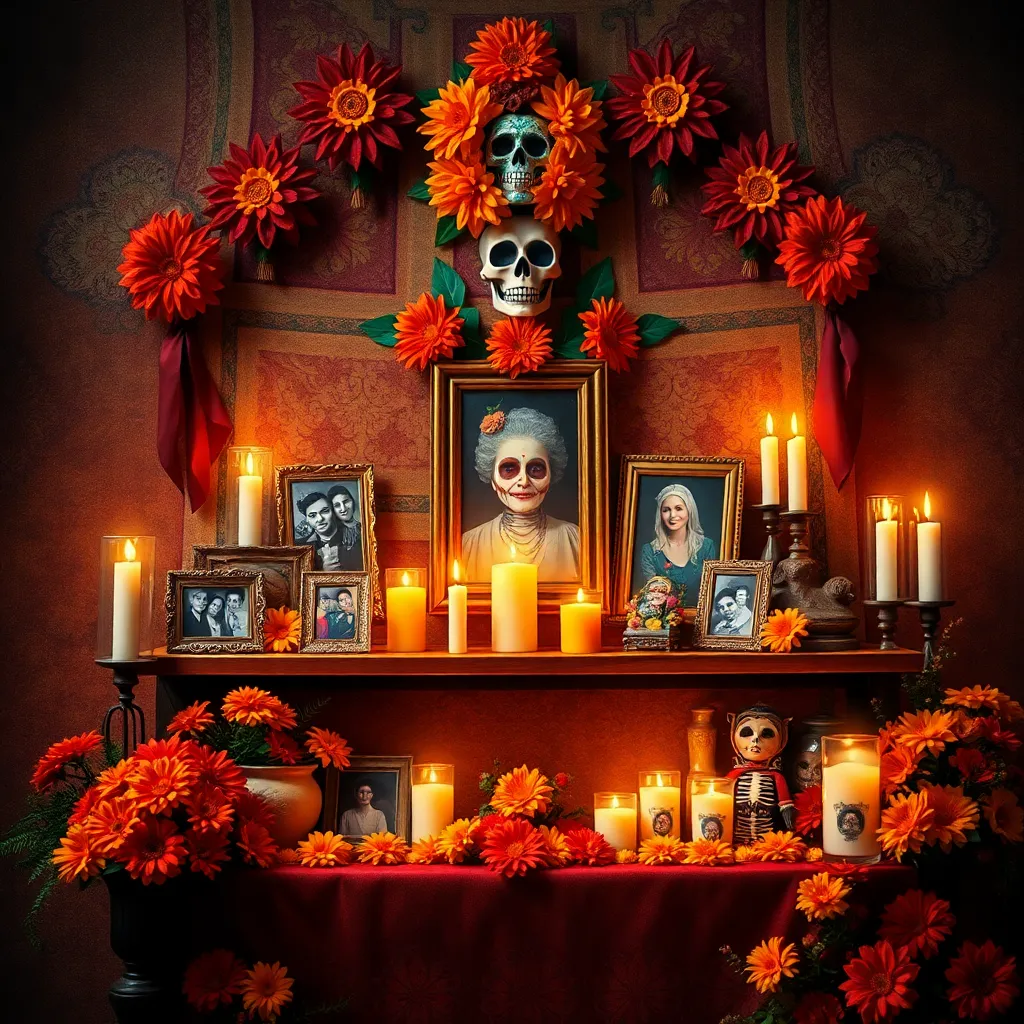 Create an AI-generated image for Day of the Dead (Día de los Muertos) that captures the vibrant spirit of the celebration. Depict a colorful altar adorned with marigolds, candles, and photographs of loved ones, surrounded by a richly textured background of traditional Mexican patterns and symbols. Incorporate a sense of warmth and nostalgia.
