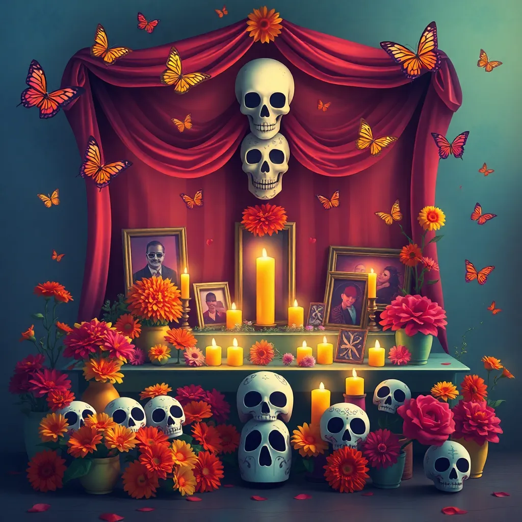 Create a vibrant and emotive AI image that captures the essence of Day of the Dead (Día de los Muertos). Depict a colorful altar adorned with marigolds, candles, and photographs of loved ones, surrounded by fluttering butterflies and a subtle background of sugar skulls and papel picado. Incorporate a sense of warmth and celebration.