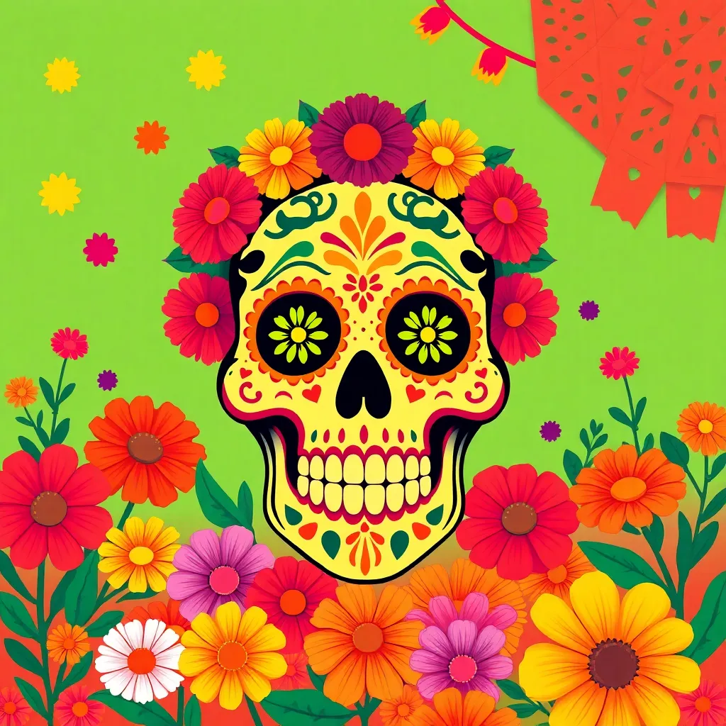 Create a vibrant and colorful AI image for Day of the Dead (Día de los Muertos) that captures the spirit of honoring loved ones who have passed. Incorporate traditional elements such as marigolds, sugar skulls, and papel picado, with a modern twist. The image should evoke a sense of celebration and remembrance.