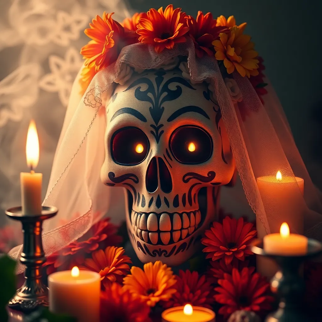 Create an eerie yet vibrant AI image for Day of the Dead (Día de los Muertos). Depict a traditional Mexican sugar skull adorned with marigolds, surrounded by candles, incense, and a faint mist. Incorporate subtle, glowing eyes and a delicate, lace-like veil. Capture the essence of honoring loved ones who've passed.