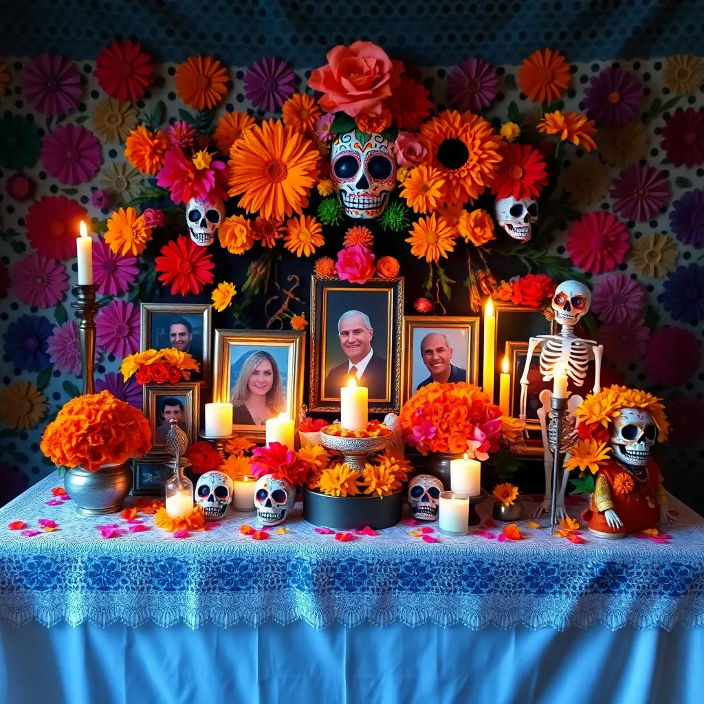 Create a vibrant and festive AI image for Day of the Dead (Día de los Muertos). Depict a colorful altar adorned with marigolds, candles, and photographs of loved ones. Incorporate traditional sugar skulls, papier-mâché skeletons, and a delicate lace doily. Capture the joy and reverence for the dearly departed.