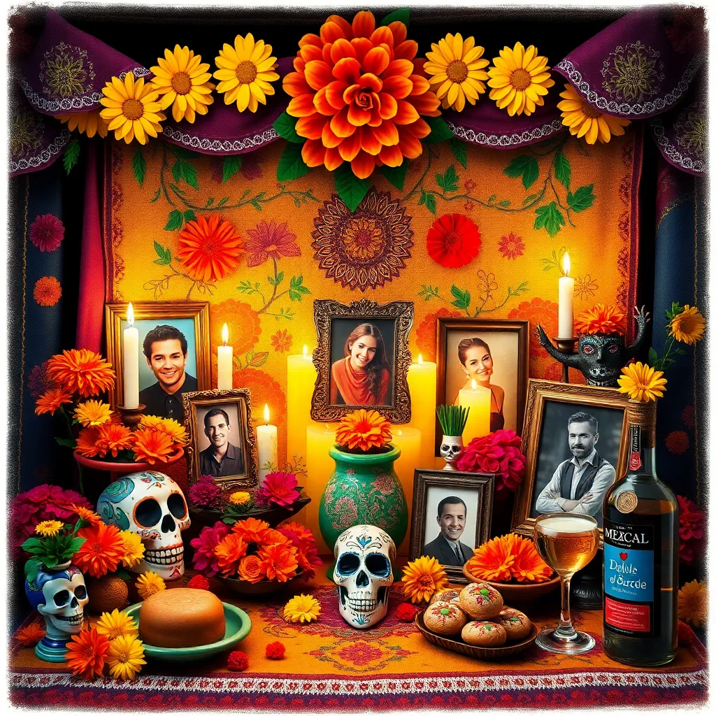 Create a vibrant AI image for Day of the Dead (Día de los Muertos) depicting a colorful altar adorned with marigolds, candles, and photographs of loved ones. Incorporate traditional sugar skulls, papier-mâché skeletons, and a backdrop of vibrant Mexican textiles. Capture the essence of celebrating life and honoring the dead.