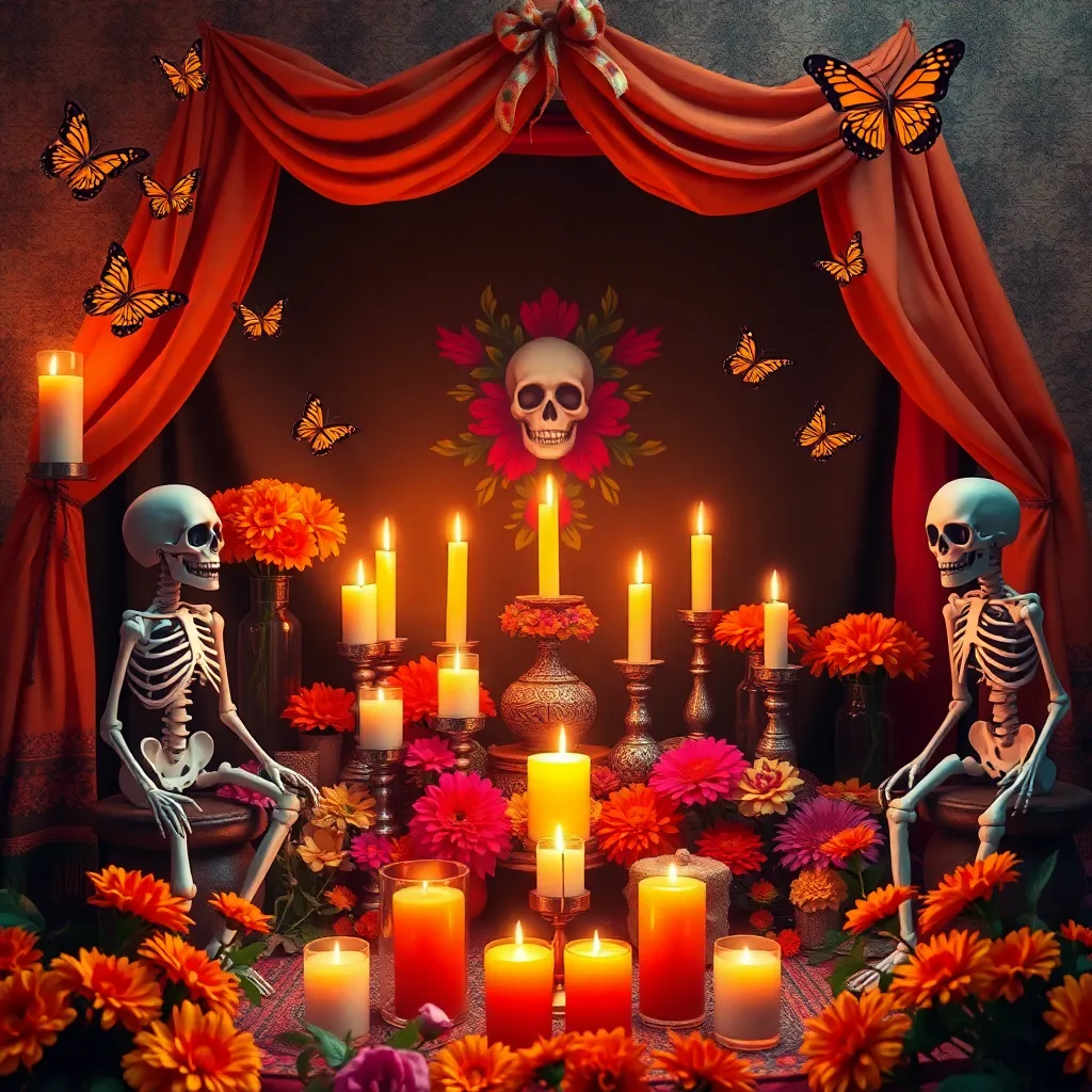 Create an AI-generated image that captures the vibrant spirit of Dia de los Muertos. Depict a colorful altar adorned with marigolds, candles, and offerings, surrounded by skeletal figures and fluttering butterflies. Incorporate traditional Mexican textiles and decorations, with a subtle glow emanating from the candles to symbolize the celebration of life and death.