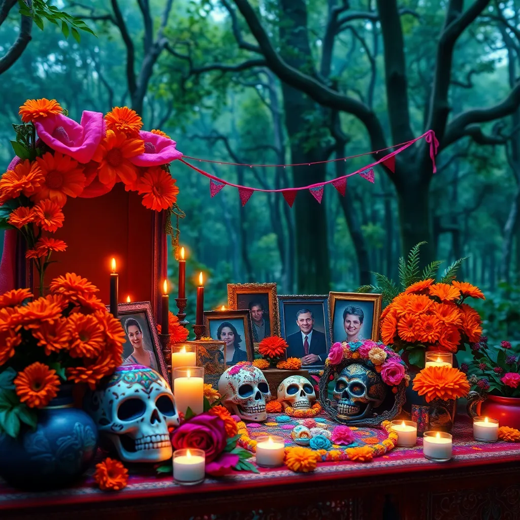 Create an AI-generated image that captures the vibrant spirit of Dia de los Muertos. Depict a colorful altar adorned with marigolds, candles, and photographs of loved ones. Incorporate traditional Mexican textiles, sugar skulls, and a backdrop of a lush, mystical forest. The atmosphere should be one of celebration and remembrance.
