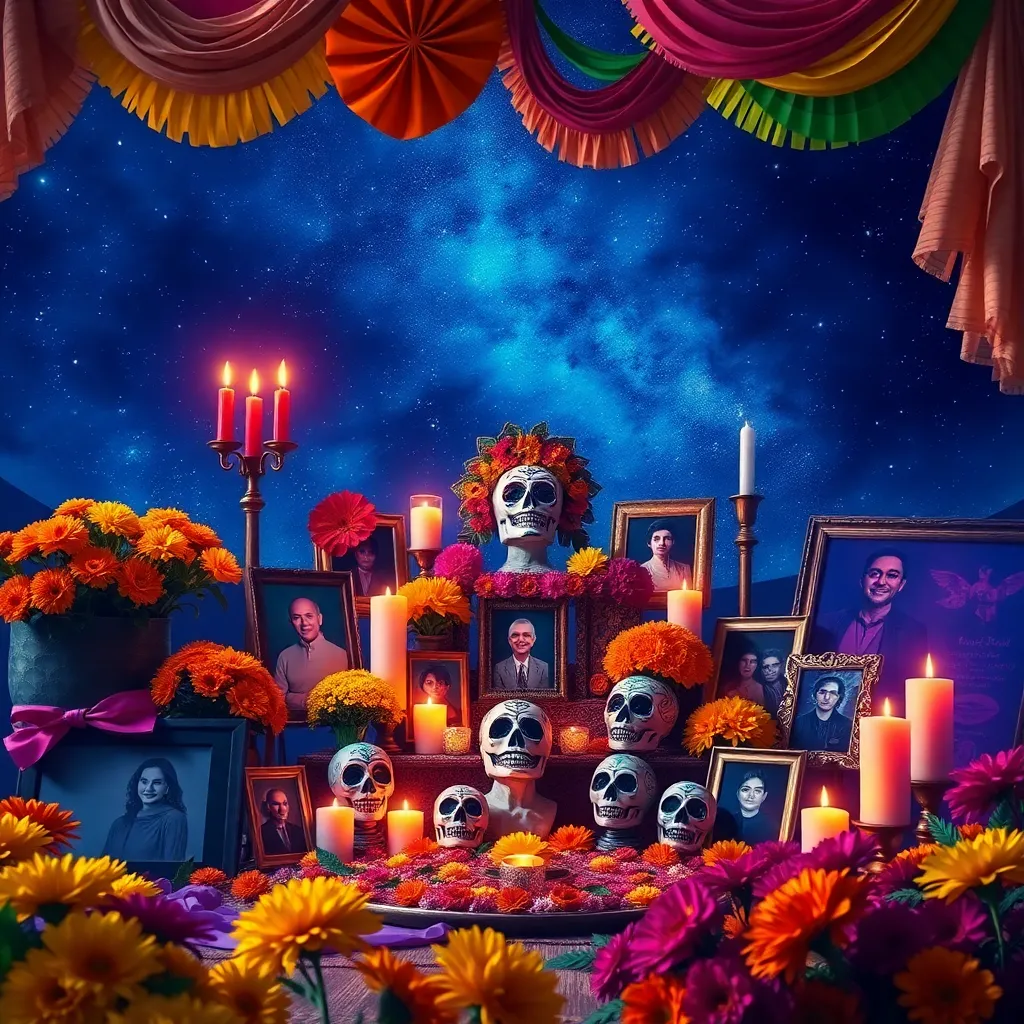 Create an AI-generated image depicting a vibrant and colorful Day of the Dead altar, surrounded by marigolds, candles, and photographs of loved ones. Incorporate traditional Mexican elements, such as papel picado and sugar skulls, amidst a backdrop of a mystical, starry night sky, evoking a sense of celebration and remembrance.