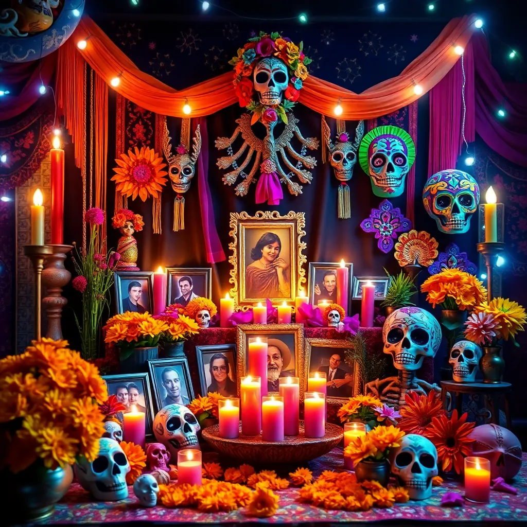Create an AI-generated image that captures the vibrant essence of Day of the Dead (Día de los Muertos). Depict a colorful altar adorned with marigolds, candles, and photographs of loved ones, surrounded by a whimsical array of sugar skulls, papel picado, and ornate masks, set against a backdrop of vibrant textiles and celestial lights.