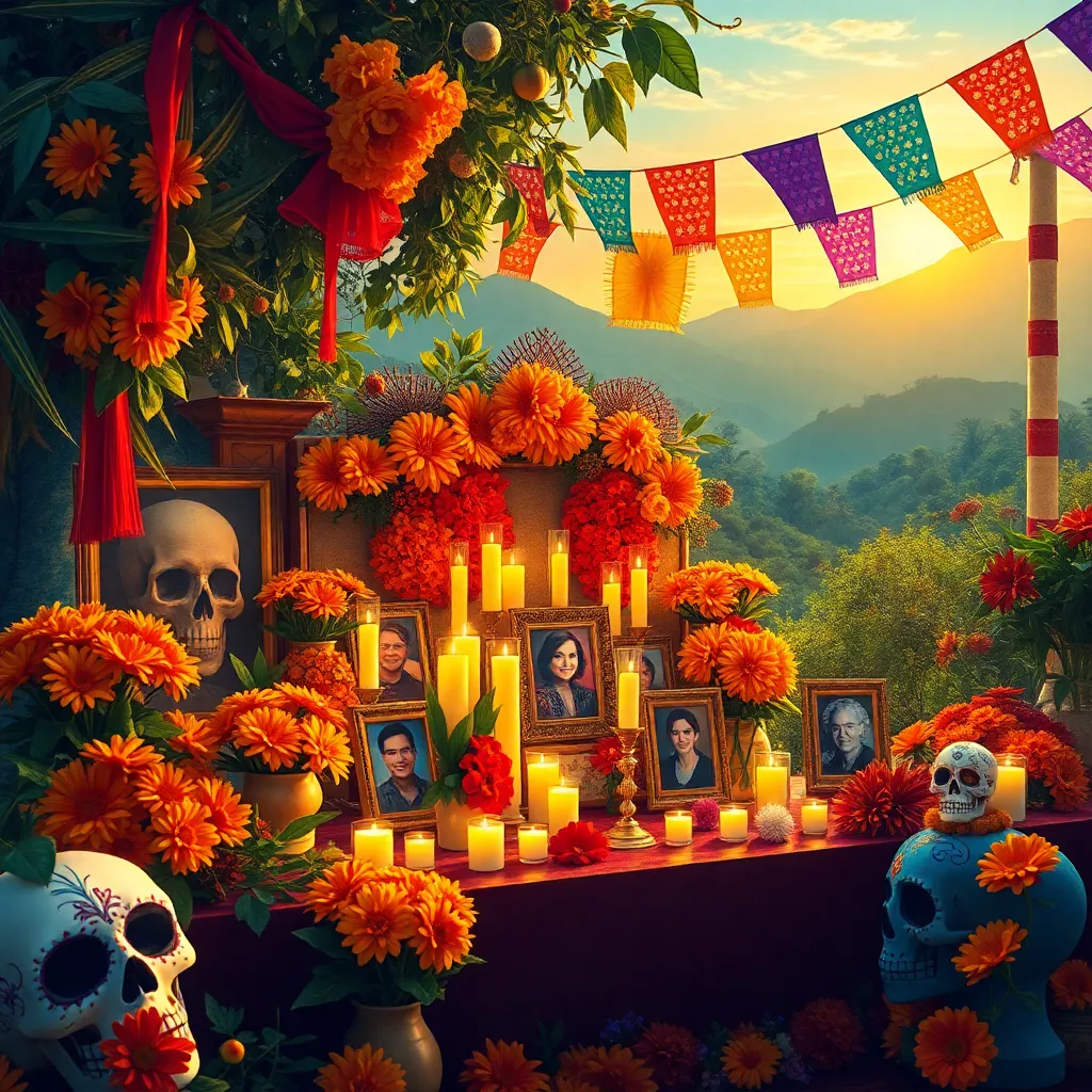 Create an AI image that captures the vibrant spirit of Dia de los Muertos. Depict a colorful altar adorned with marigolds, candles, and photographs of loved ones, surrounded by a lush Mexican landscape. Incorporate symbols of the celebration, such as sugar skulls and papel picado, and a warm, golden light.